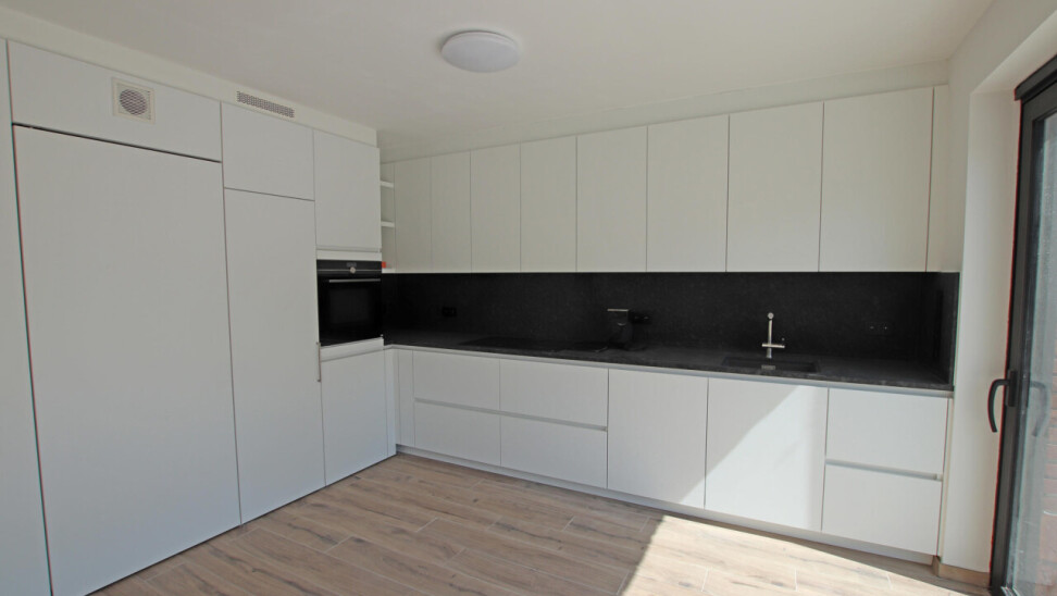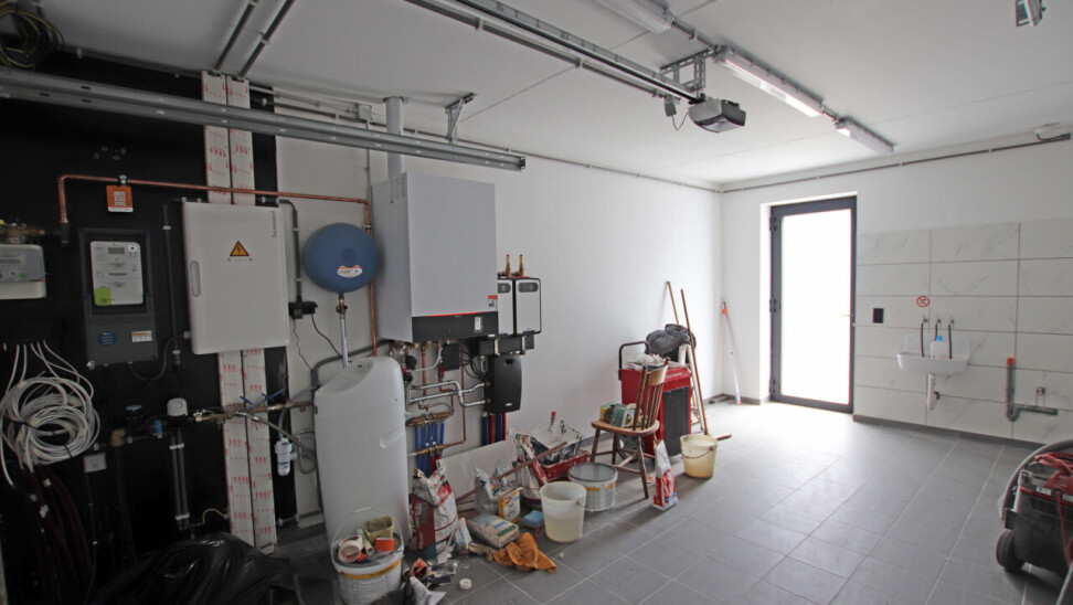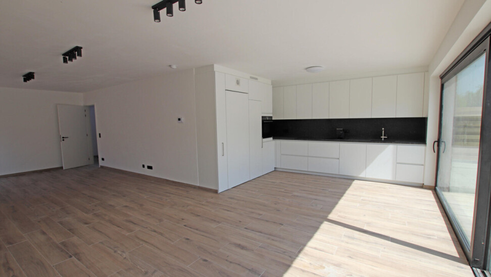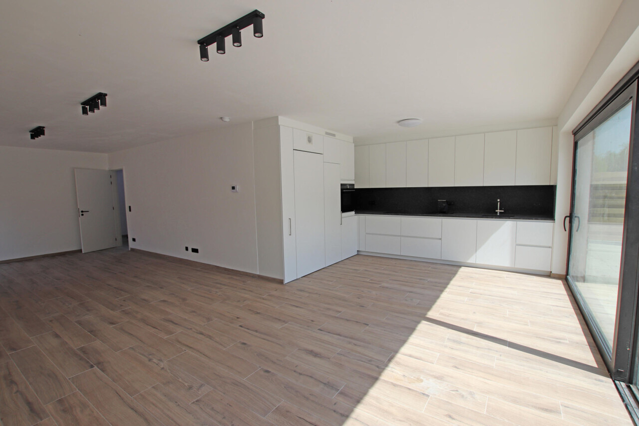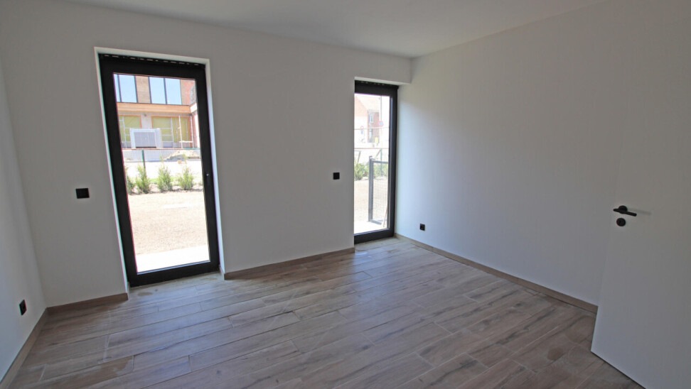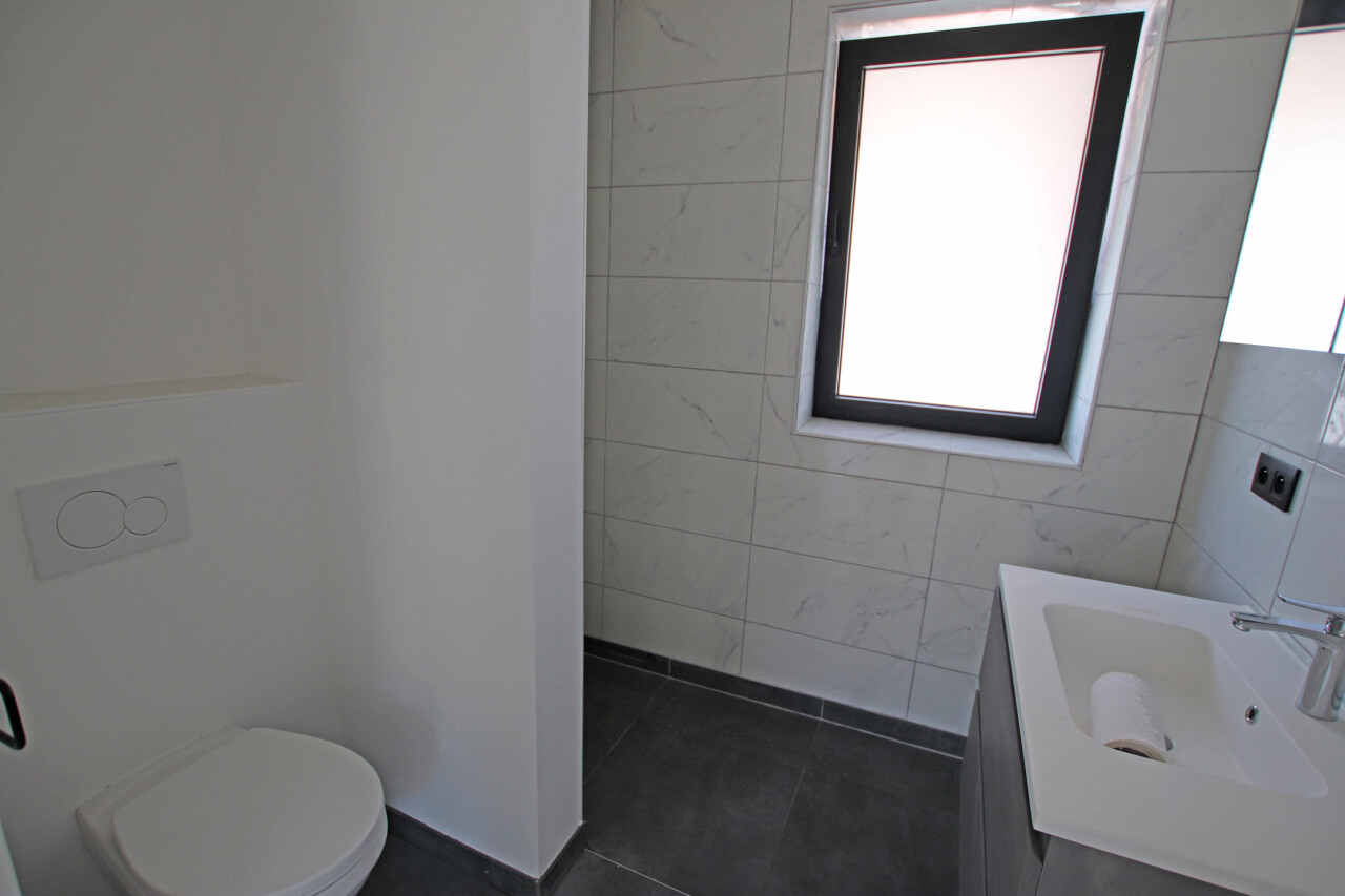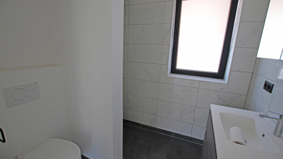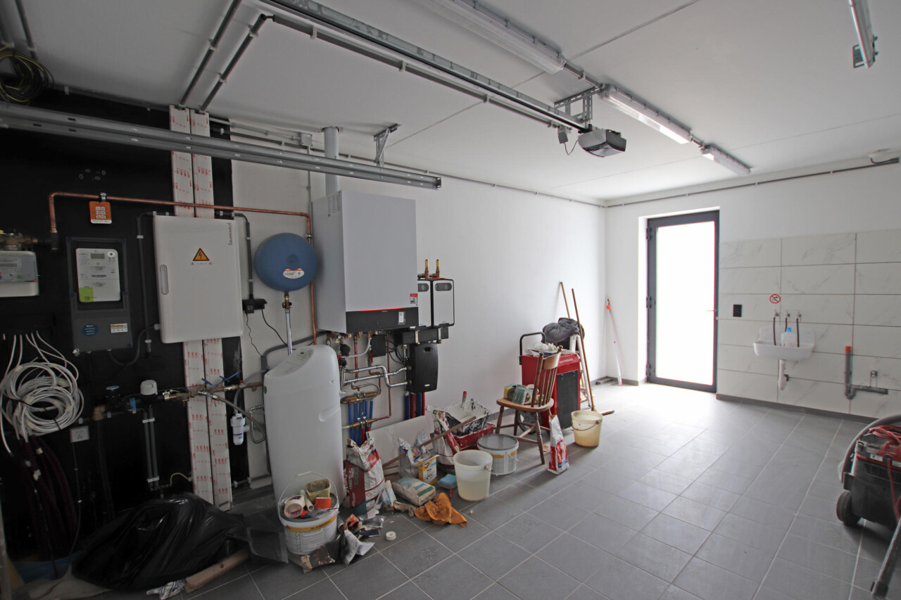 Rez-de-chaussée : hall d'entrée, toilette séparé avec lave-mains, spacieux living de 40m², cuisine de luxe entièrement équipée, débarras/buanderie, garage spacieux avec porte automatique, chambre à coucher avec salle de douche en suite (douche à l'italienne, lavabo en meuble et toilette).