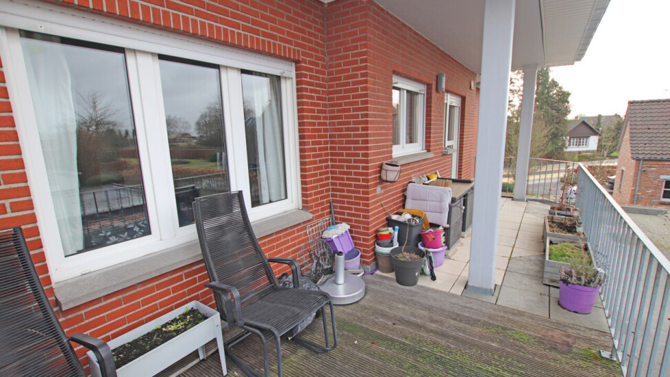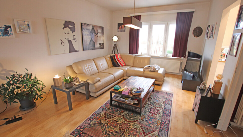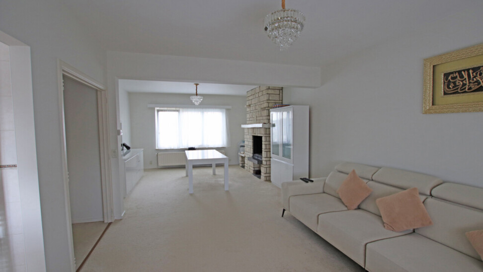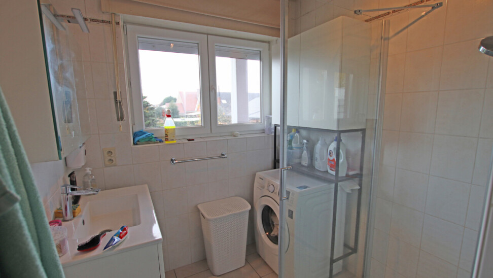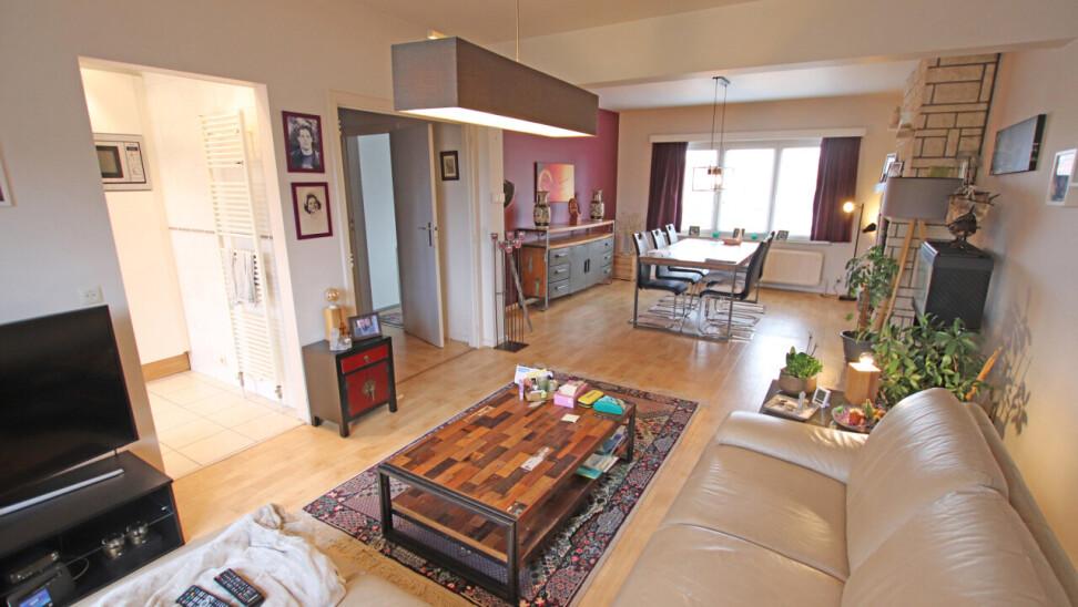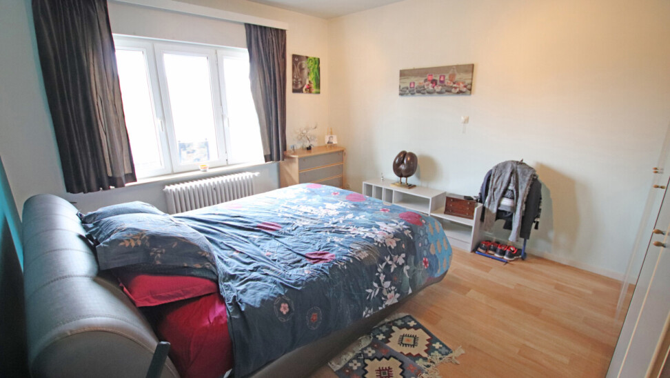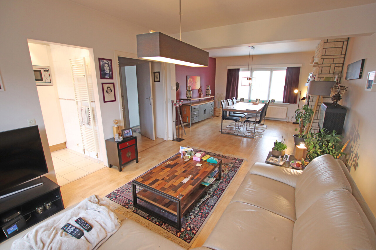 Indeling: inkomhal, 30m² woonkamer, volledig ingerichte keuken met toegang tot terras, apart toilet, 2 ruime slaapkamers van 19m² en 14m², ingerichte badkamer met douche en 1 wastafel in meubel.