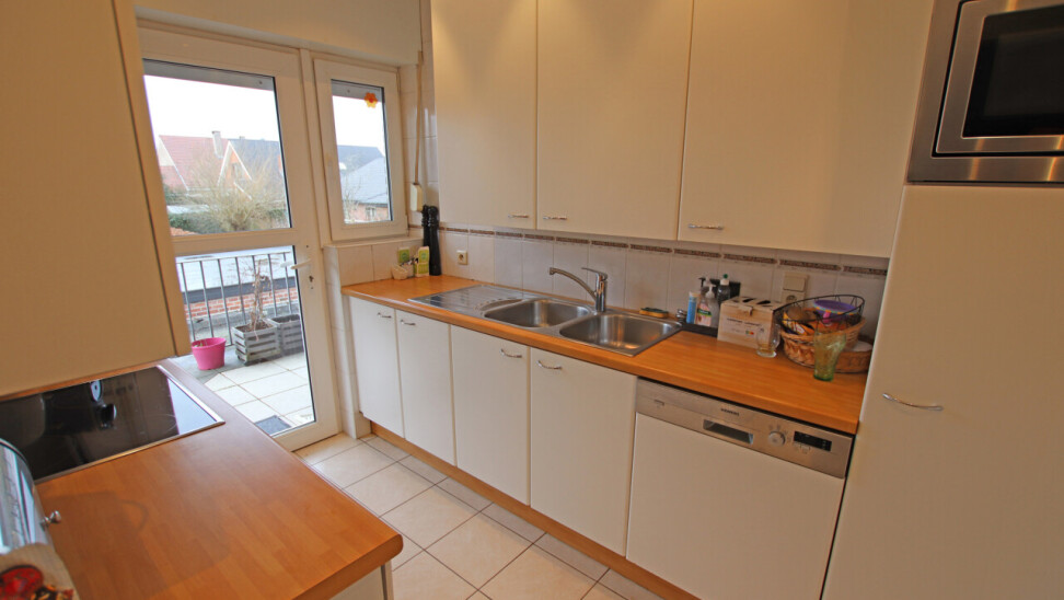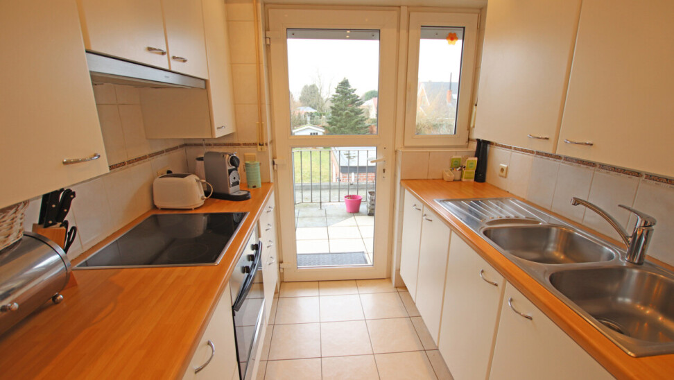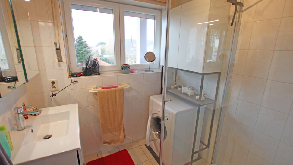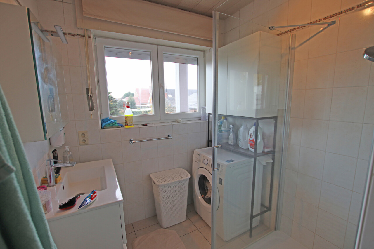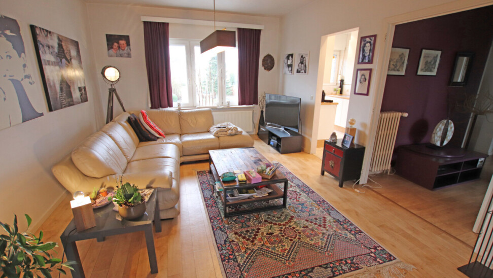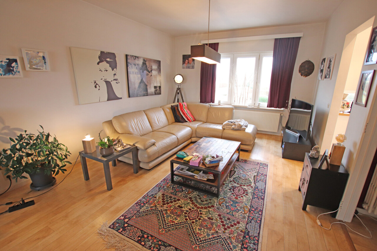 Indeling: inkomhal, 30m² woonkamer, volledig ingerichte keuken met toegang tot terras, apart toilet, 2 ruime slaapkamers van 19m² en 14m², ingerichte badkamer met douche en 1 wastafel in meubel.