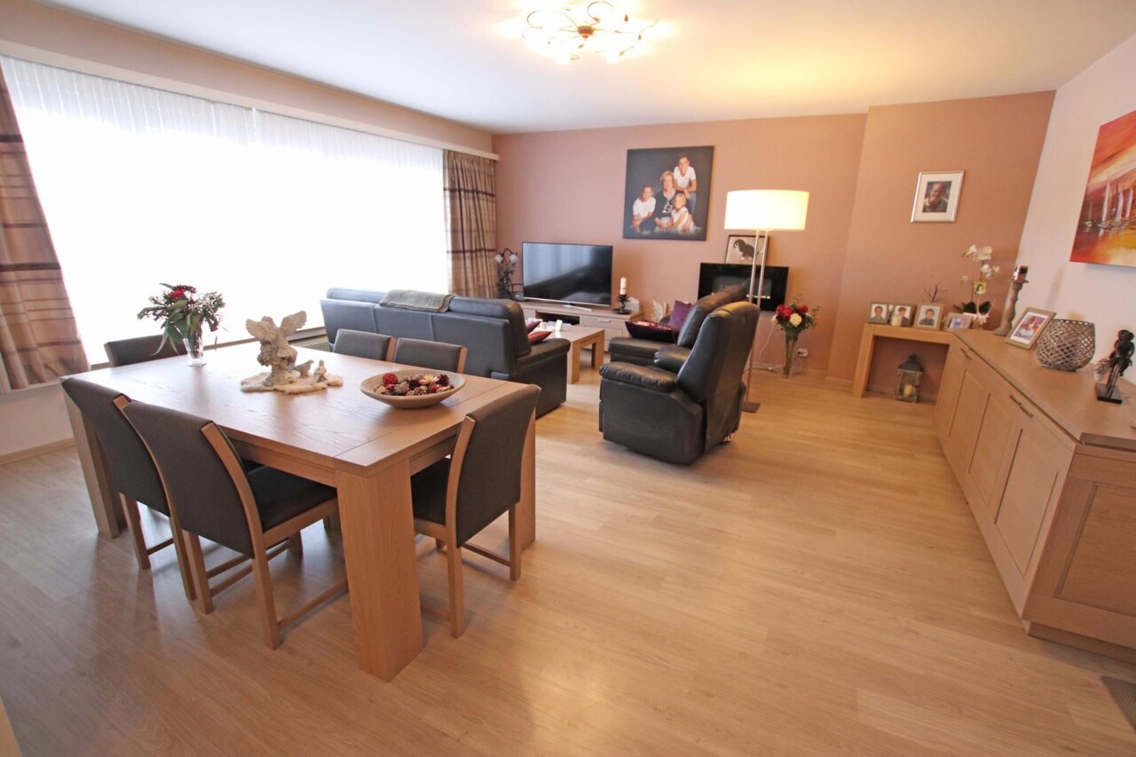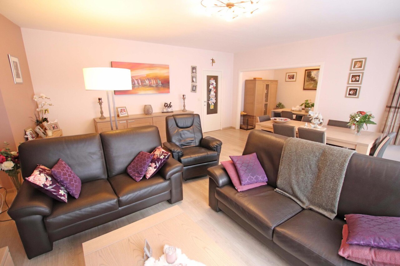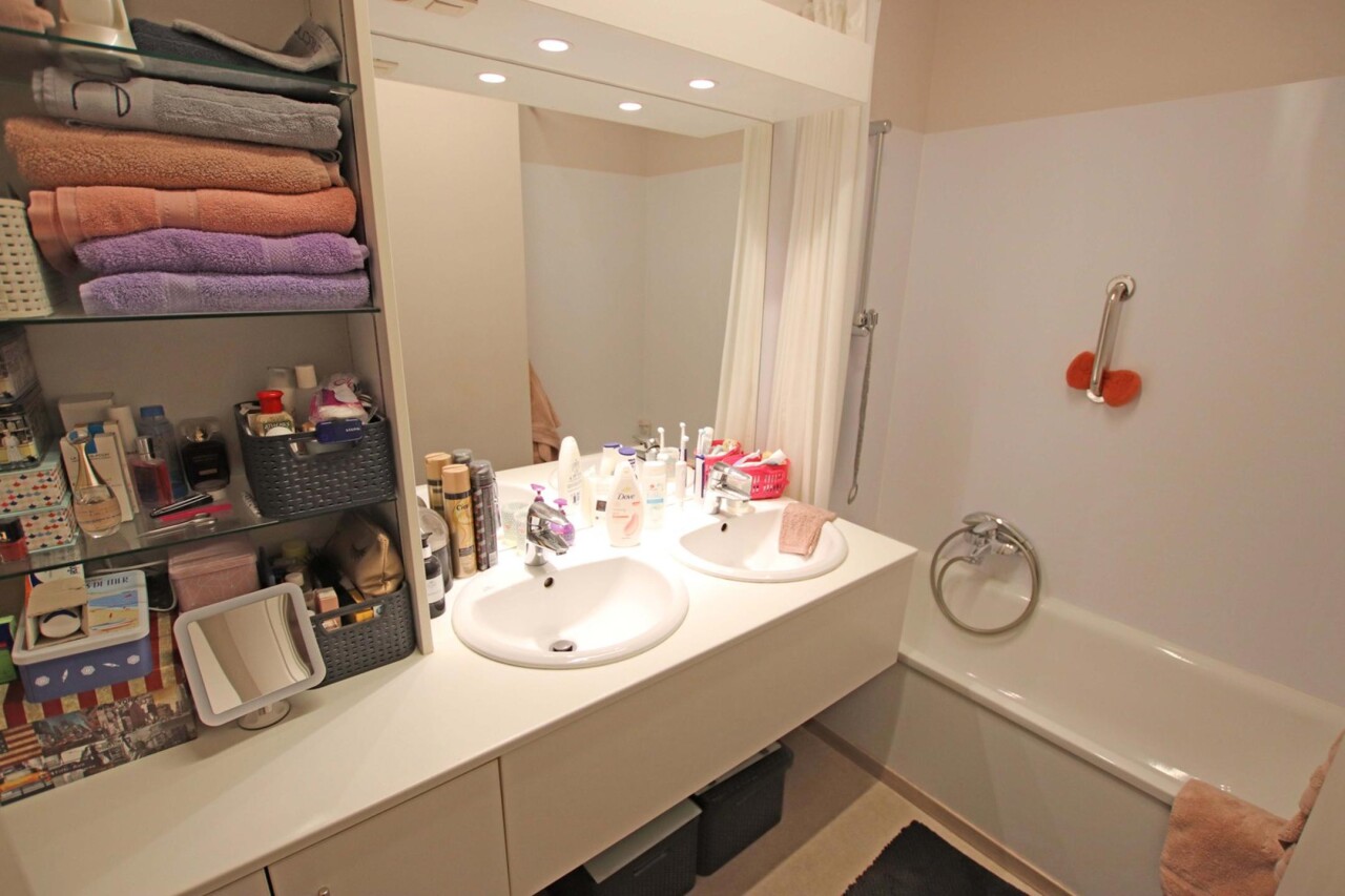 Eerste verdieping (met lift): inkomhal met apart toilet, woonkamer van 44m² met terras, ingerichte keuken, 2 ruime kamers (18m² + 16m²) waarvan een met terras, ingerichte badkamer (douche in bad met 2 wastafels in meubel), wasplaats, 2 bergingen.