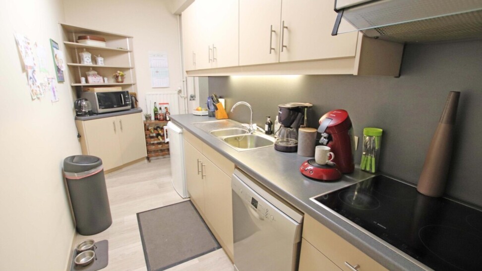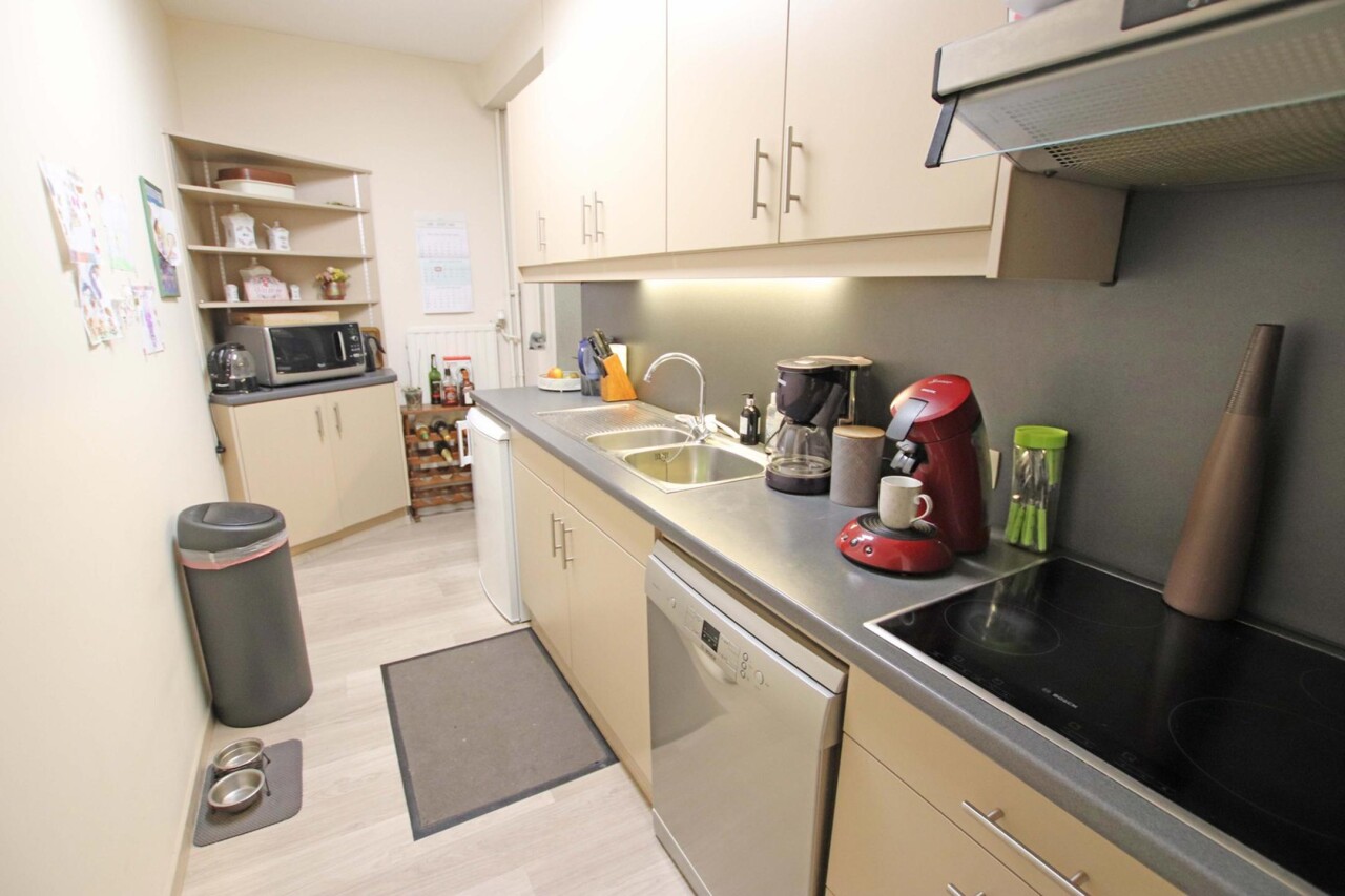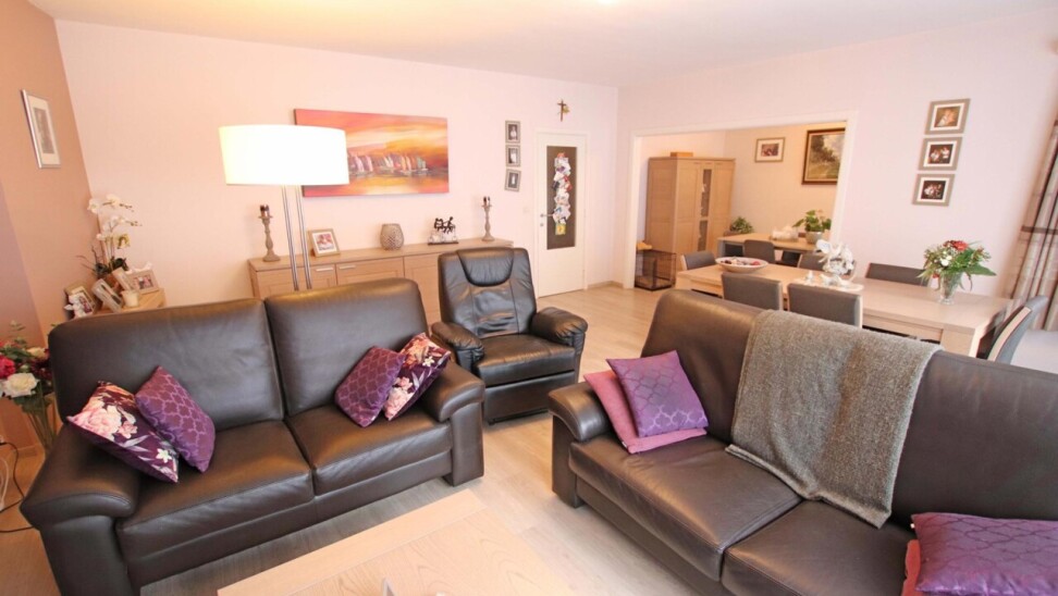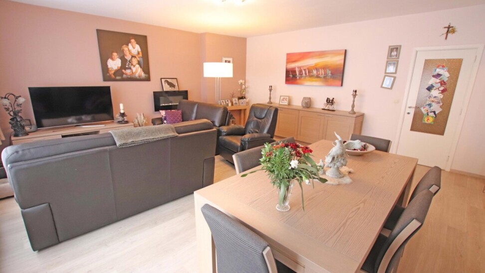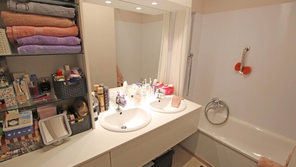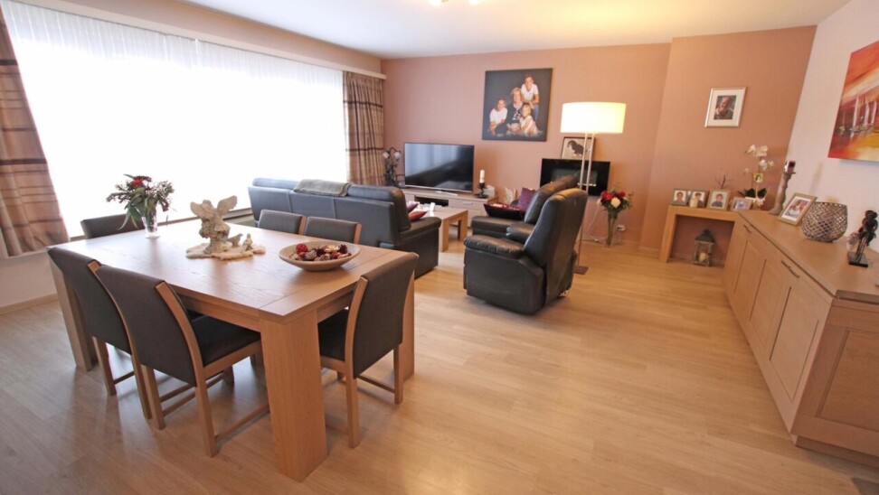 Eerste verdieping (met lift): inkomhal met apart toilet, woonkamer van 44m² met terras, ingerichte keuken, 2 ruime kamers (18m² + 16m²) waarvan een met terras, ingerichte badkamer (douche in bad met 2 wastafels in meubel), wasplaats, 2 bergingen.