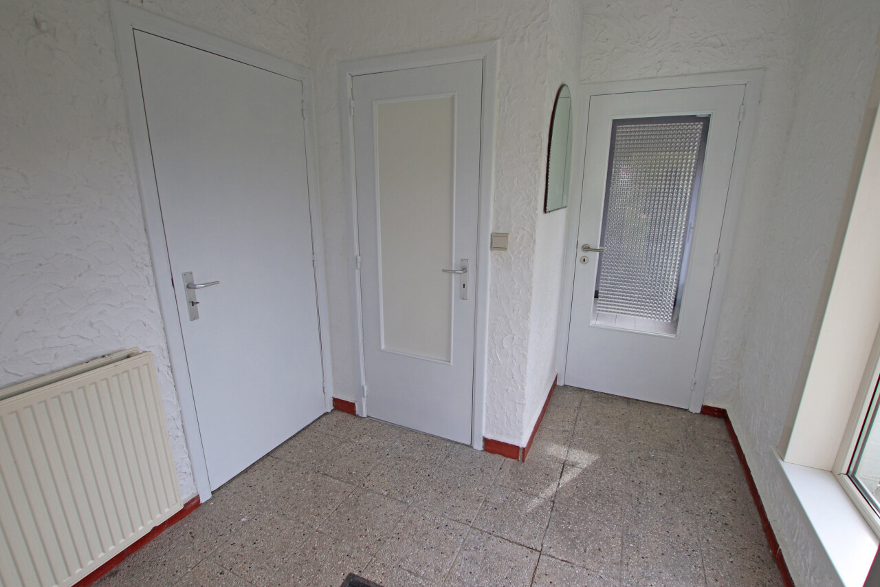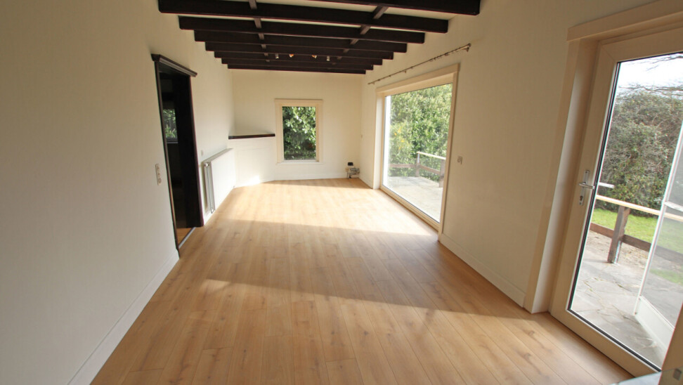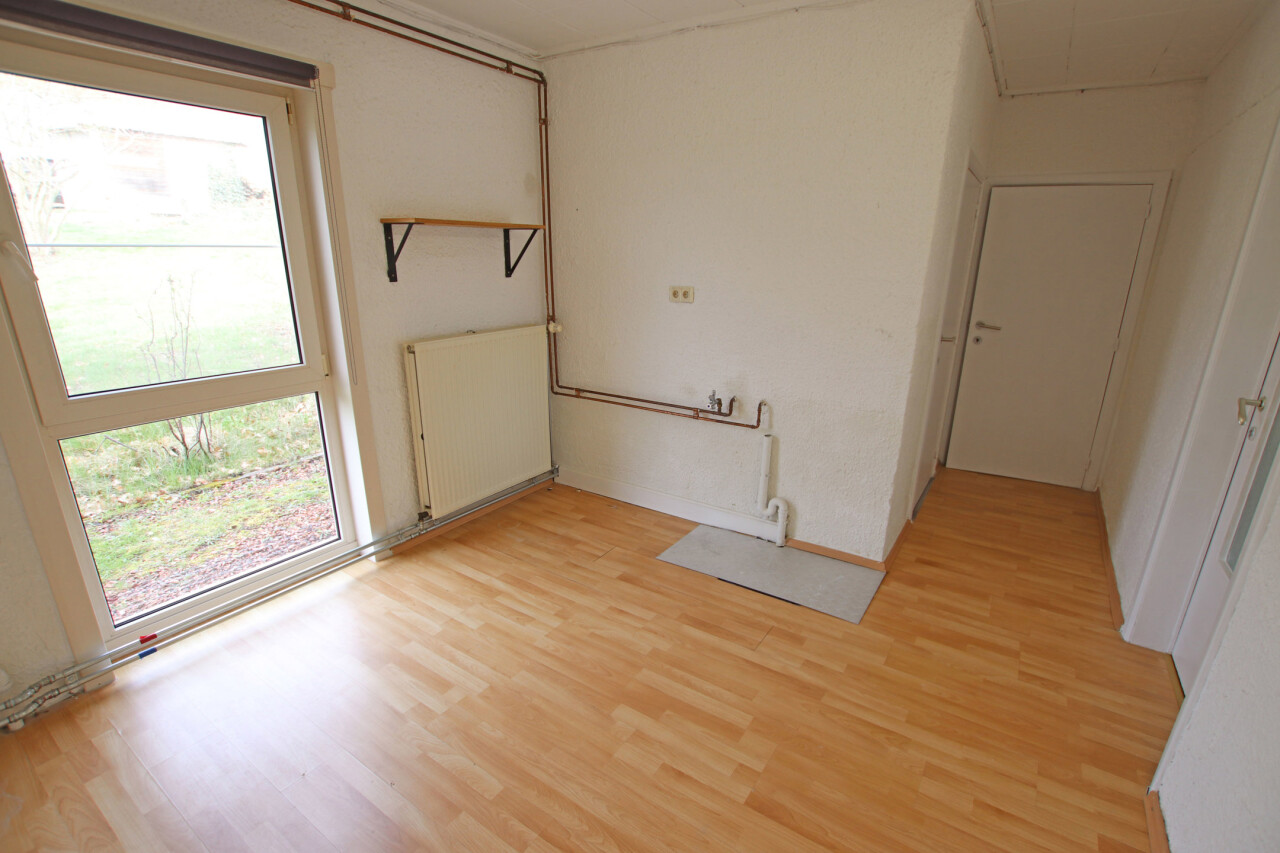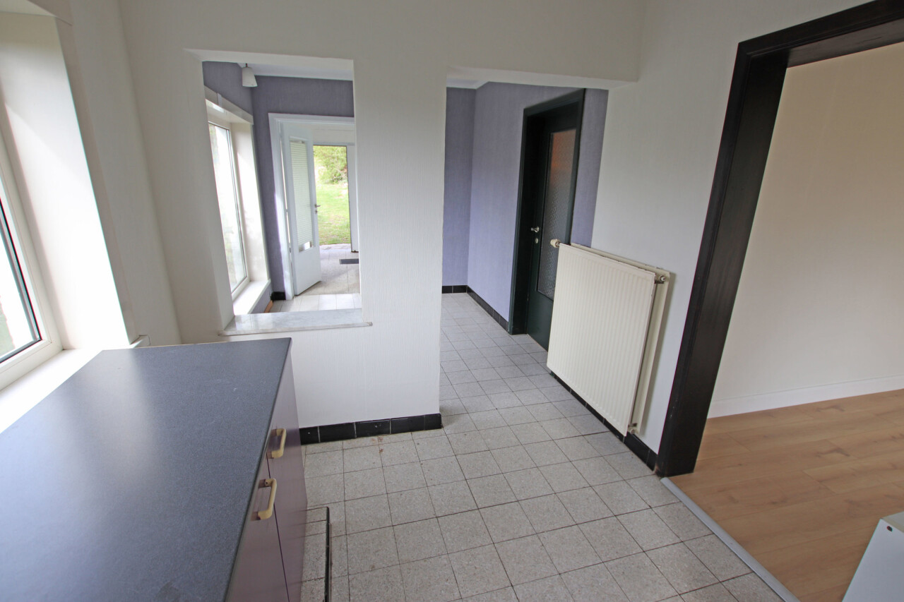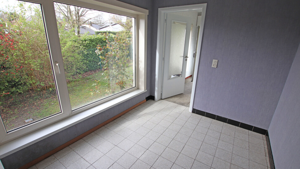Gelijkvloerse verdieping: inkomhal met apart toilet, 23m² woonkamer met nieuwe laminaat, keuken met fornuis en dampkap, nachthal met kasten, slaapkamer 1 (10m²) met kast, slaapkamer 2/bureau (9m²) met kast, ingerichte badkamer met ligbad en 1 wastafel, wasplaats met douche, berging.