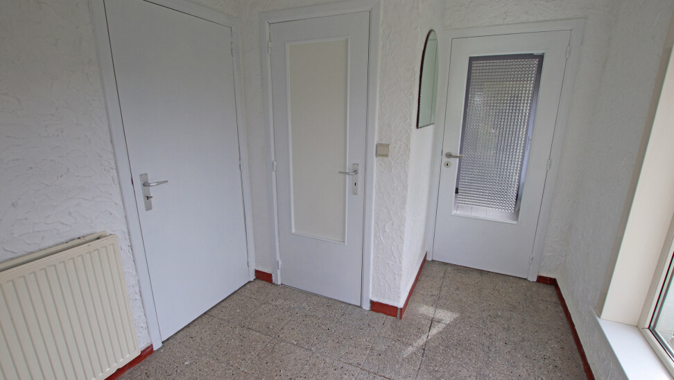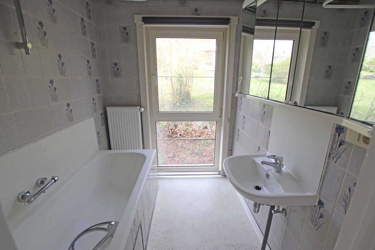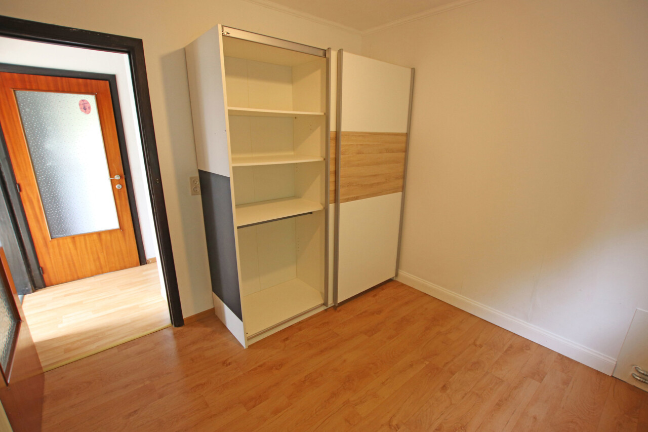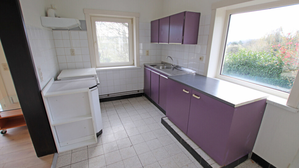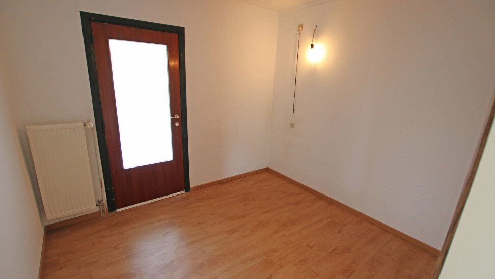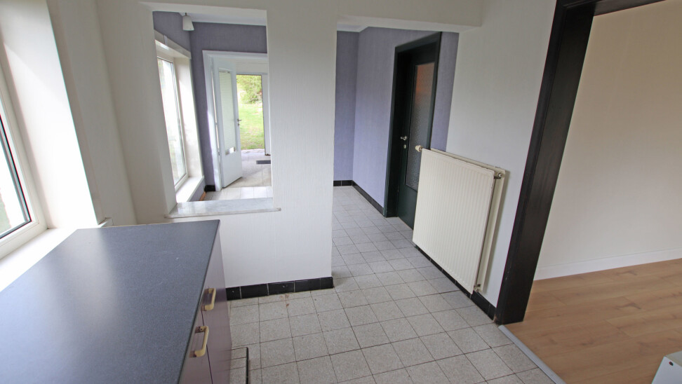 Gelijkvloerse verdieping: inkomhal met apart toilet, 23m² woonkamer met nieuwe laminaat, keuken met fornuis en dampkap, nachthal met kasten, slaapkamer 1 (10m²) met kast, slaapkamer 2/bureau (9m²) met kast, ingerichte badkamer met ligbad en 1 wastafel, wasplaats met douche, berging.