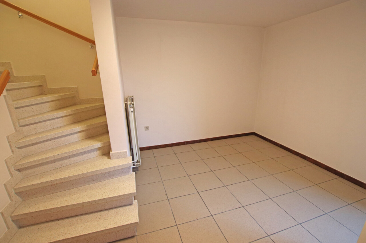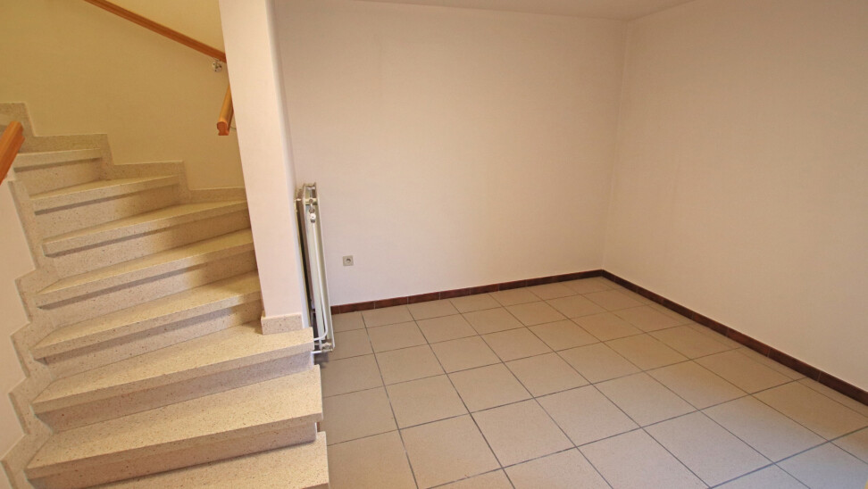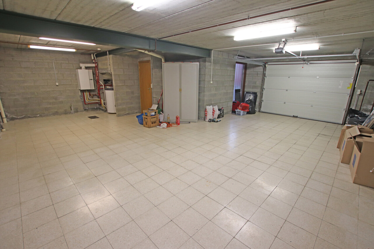 Gelijkvloerse verdieping: ruime inkomhal, garage voor verschillende wagens met elektrische poort.