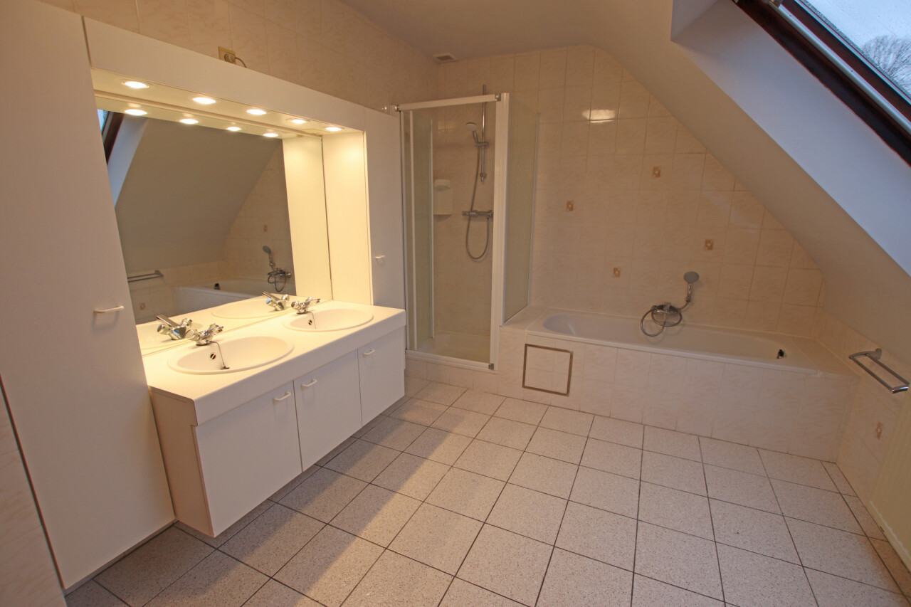 Tweede verdieping: nachthal met apart toilet, 3 slaapkamers (20m² + 18m² + 14m²), ingerichte badkamer met douche, ligbad en 2 wastafels in meubel.