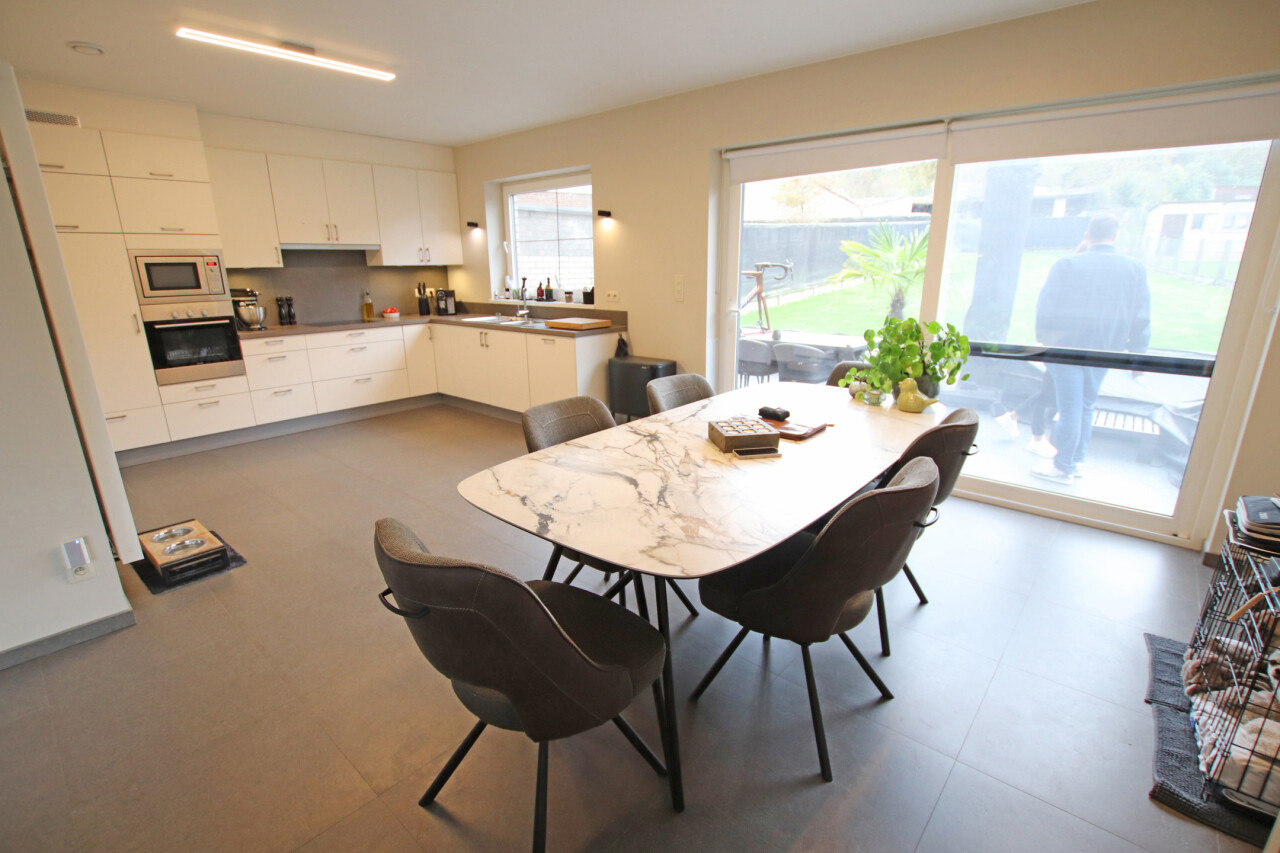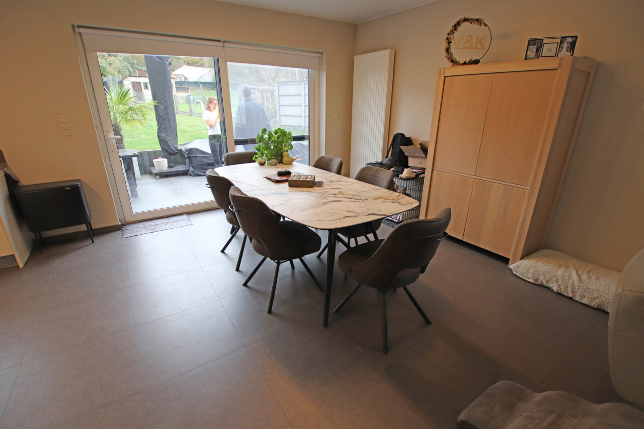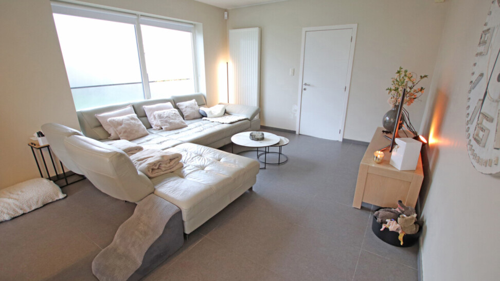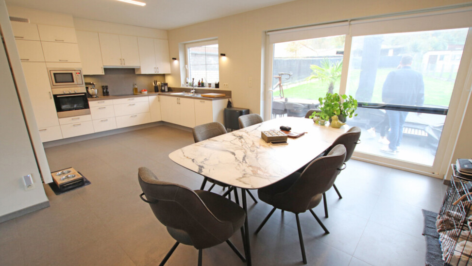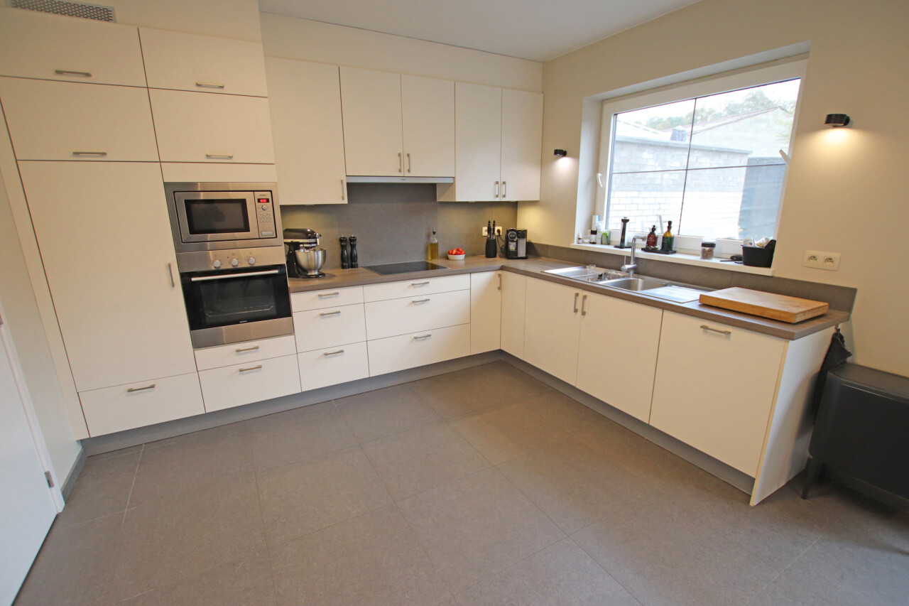 Gelijkvloerse verdieping: inkomhal, apart toilet, 33m² woonkamer met tegelvloer en schuifraam naar terras en tuin, open plan ingerichte keuken van (vaatwasser, kookplaat, oven, microgolf en koelkast), berging/wasplaats, garage voor 1 wagen met automatische poort.