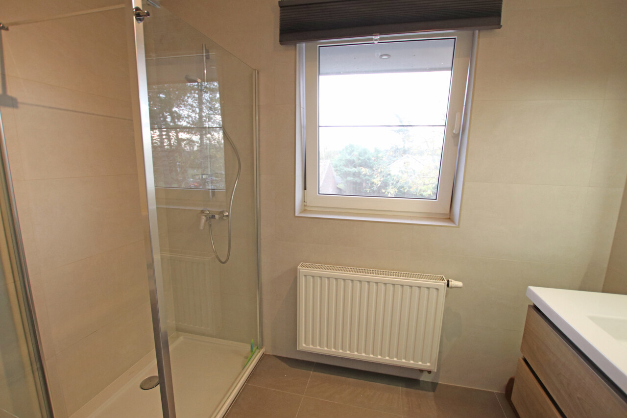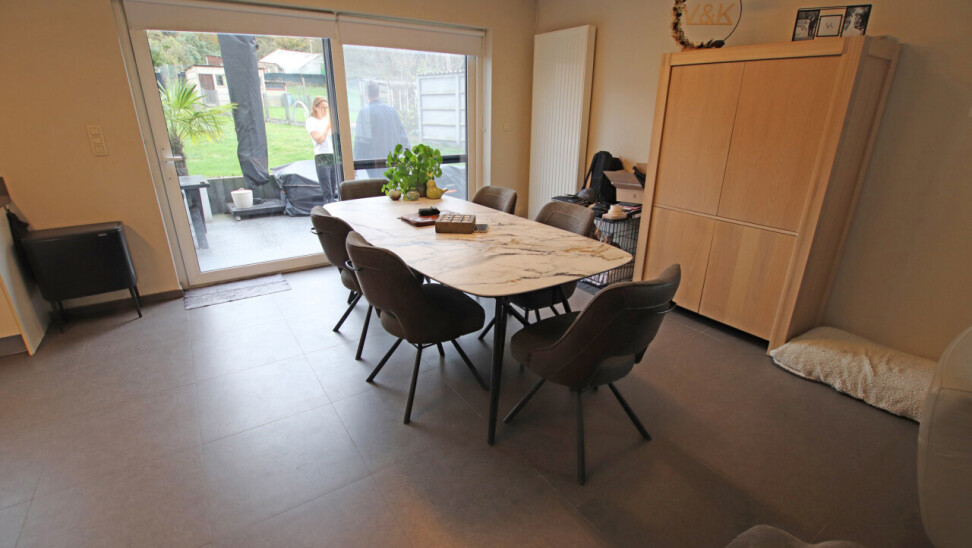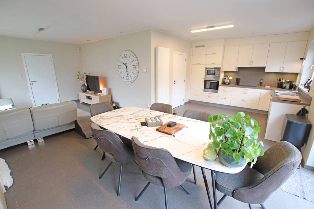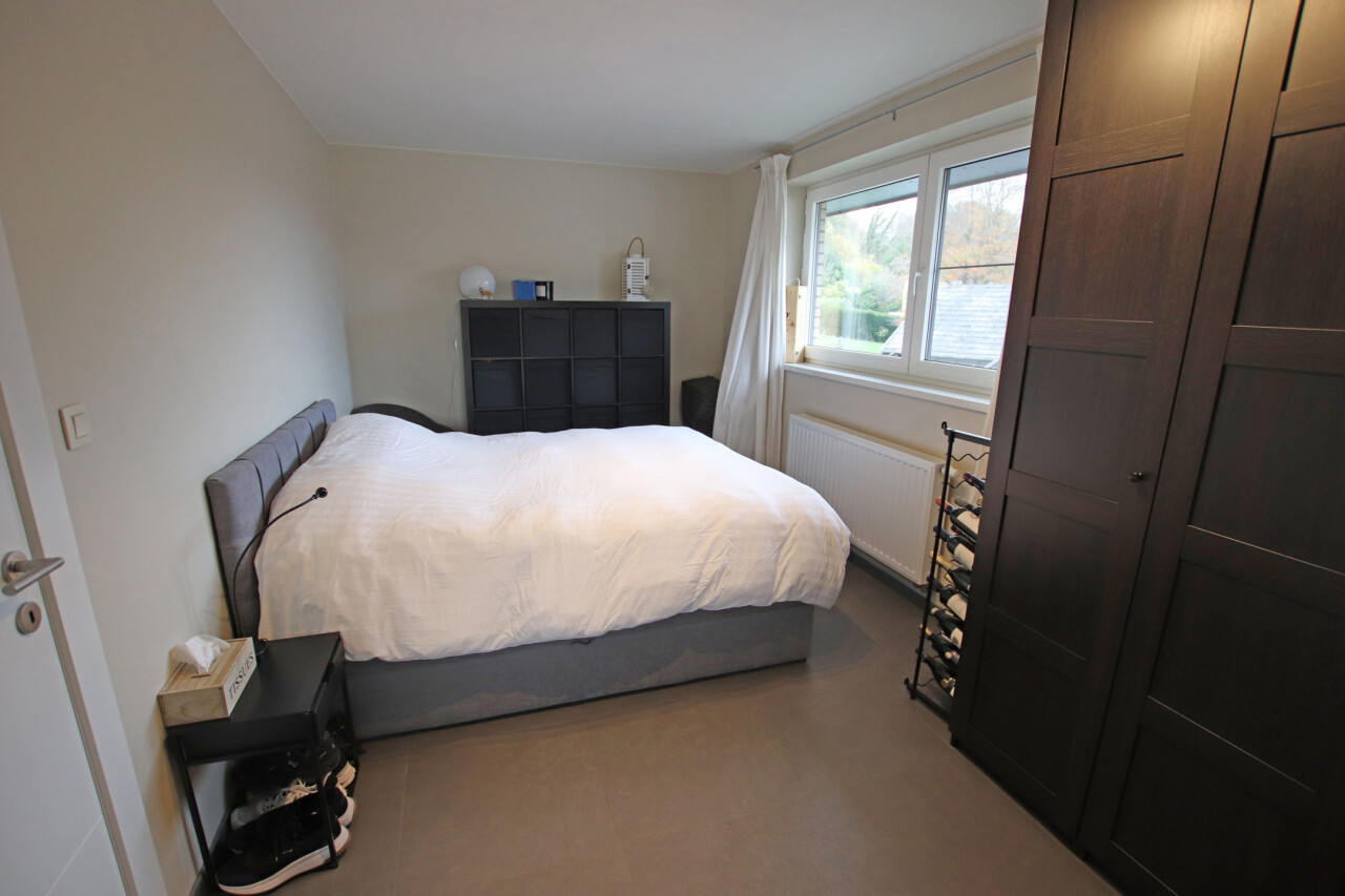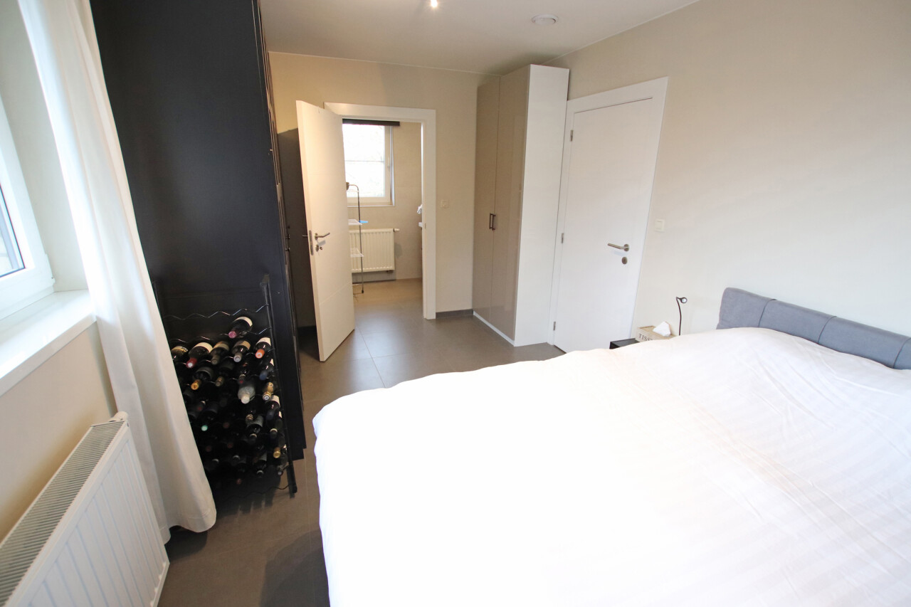 Gelijkvloerse verdieping: inkomhal, apart toilet, 33m² woonkamer met tegelvloer en schuifraam naar terras en tuin, open plan ingerichte keuken van (vaatwasser, kookplaat, oven, microgolf en koelkast), berging/wasplaats, garage voor 1 wagen met automatische poort.