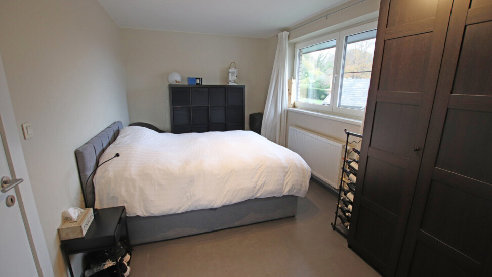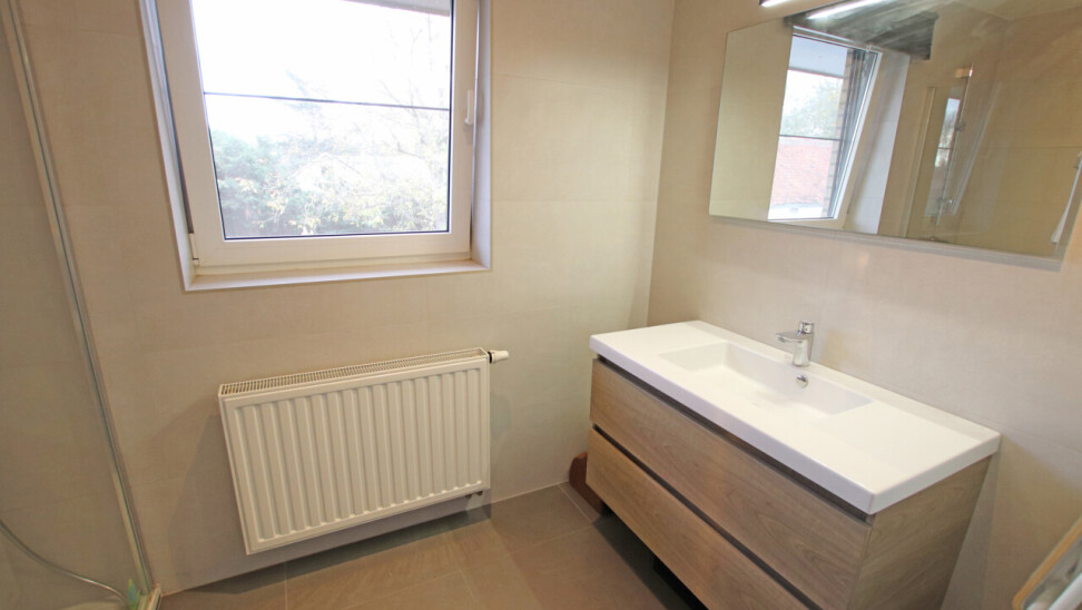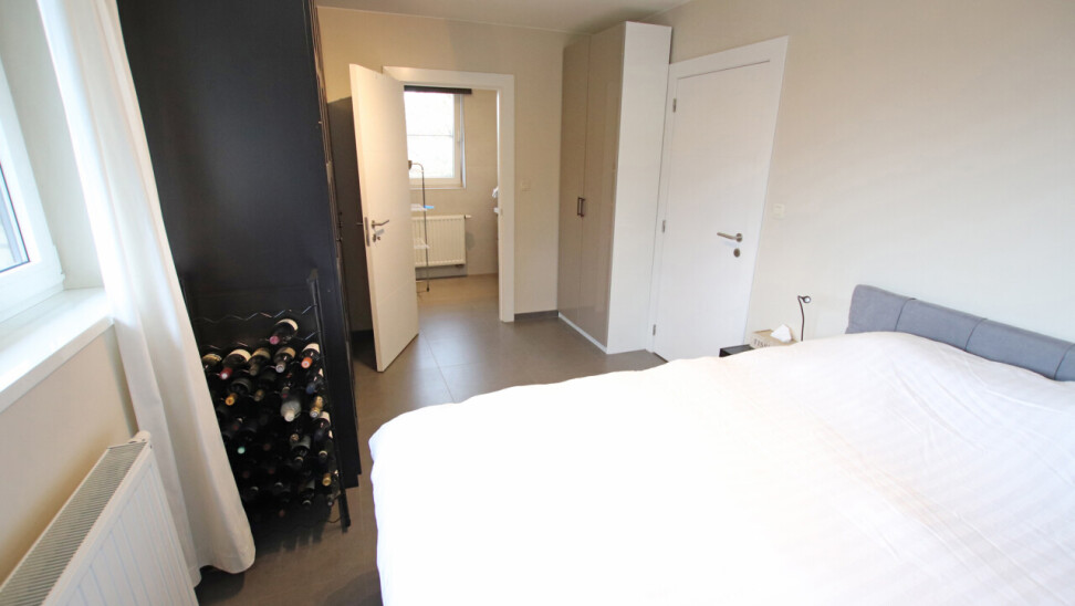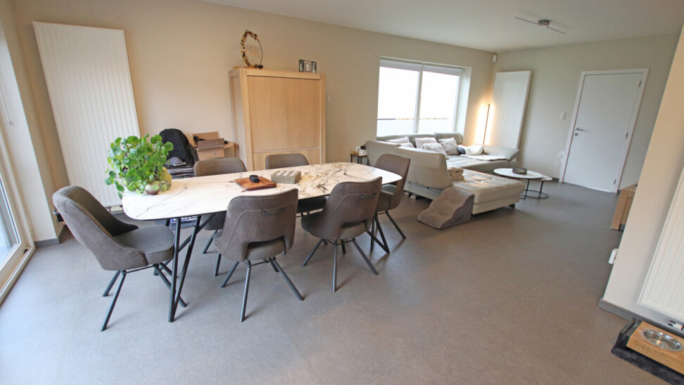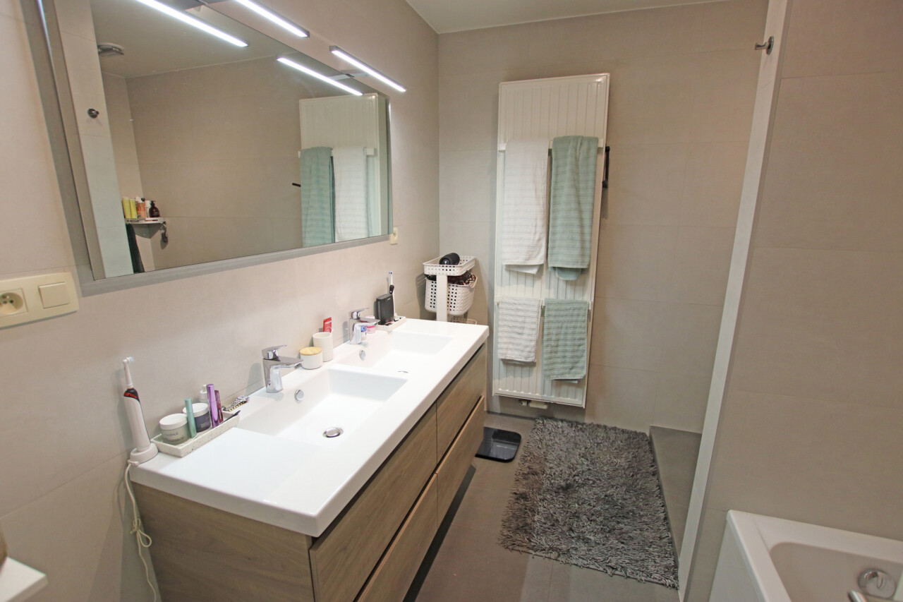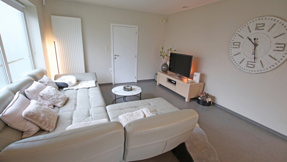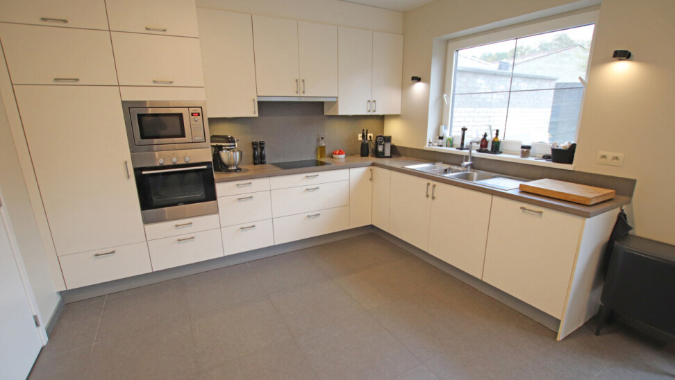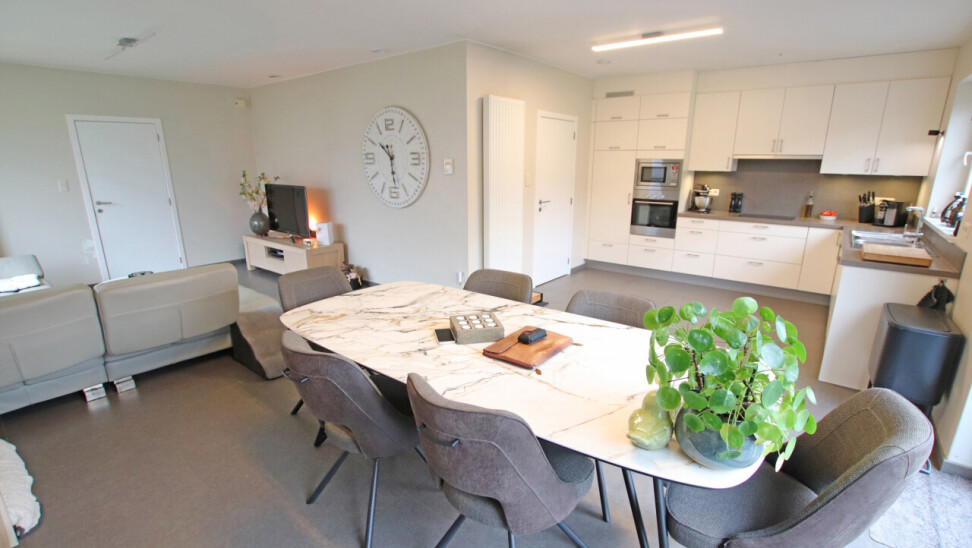 Gelijkvloerse verdieping: inkomhal, apart toilet, 33m² woonkamer met tegelvloer en schuifraam naar terras en tuin, open plan ingerichte keuken van (vaatwasser, kookplaat, oven, microgolf en koelkast), berging/wasplaats, garage voor 1 wagen met automatische poort.