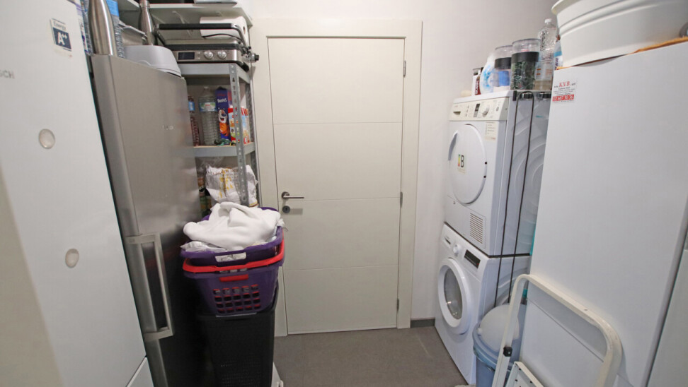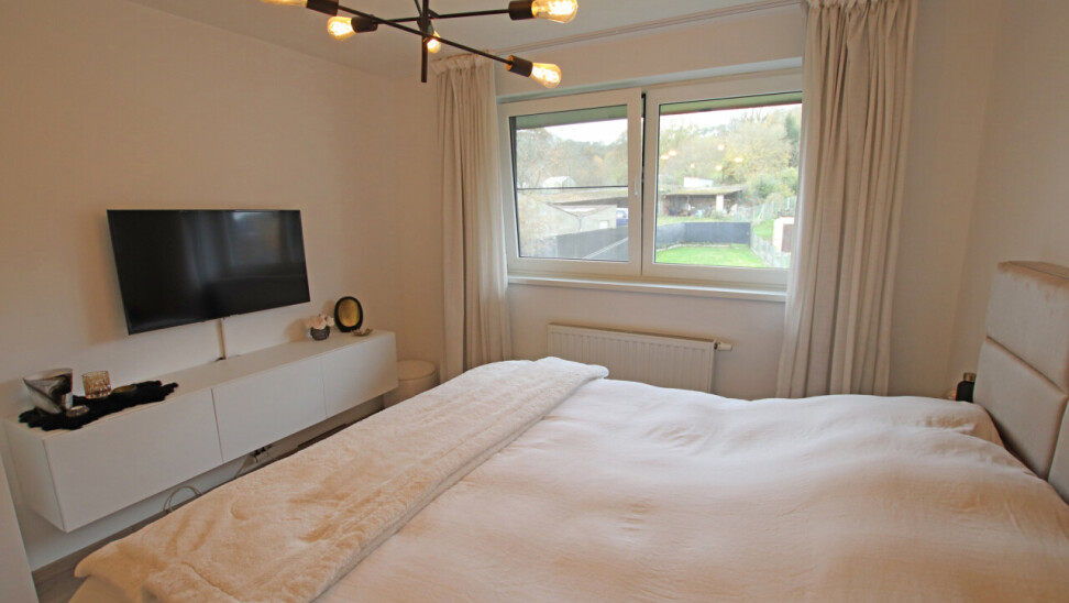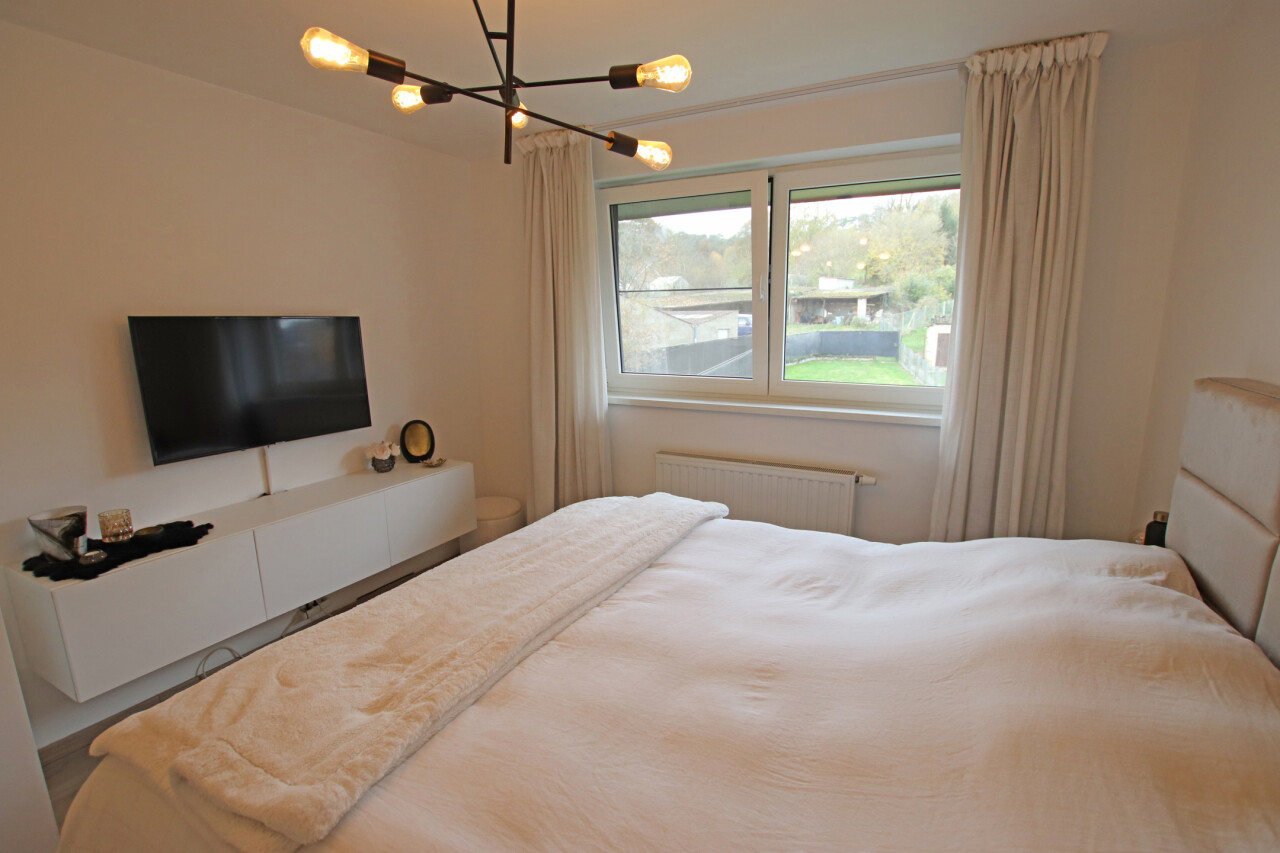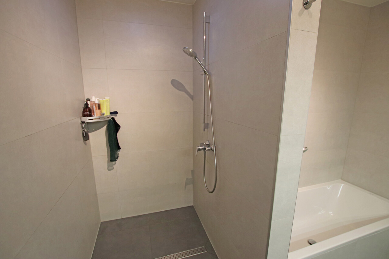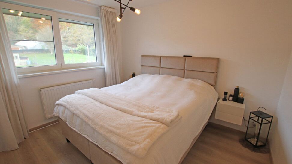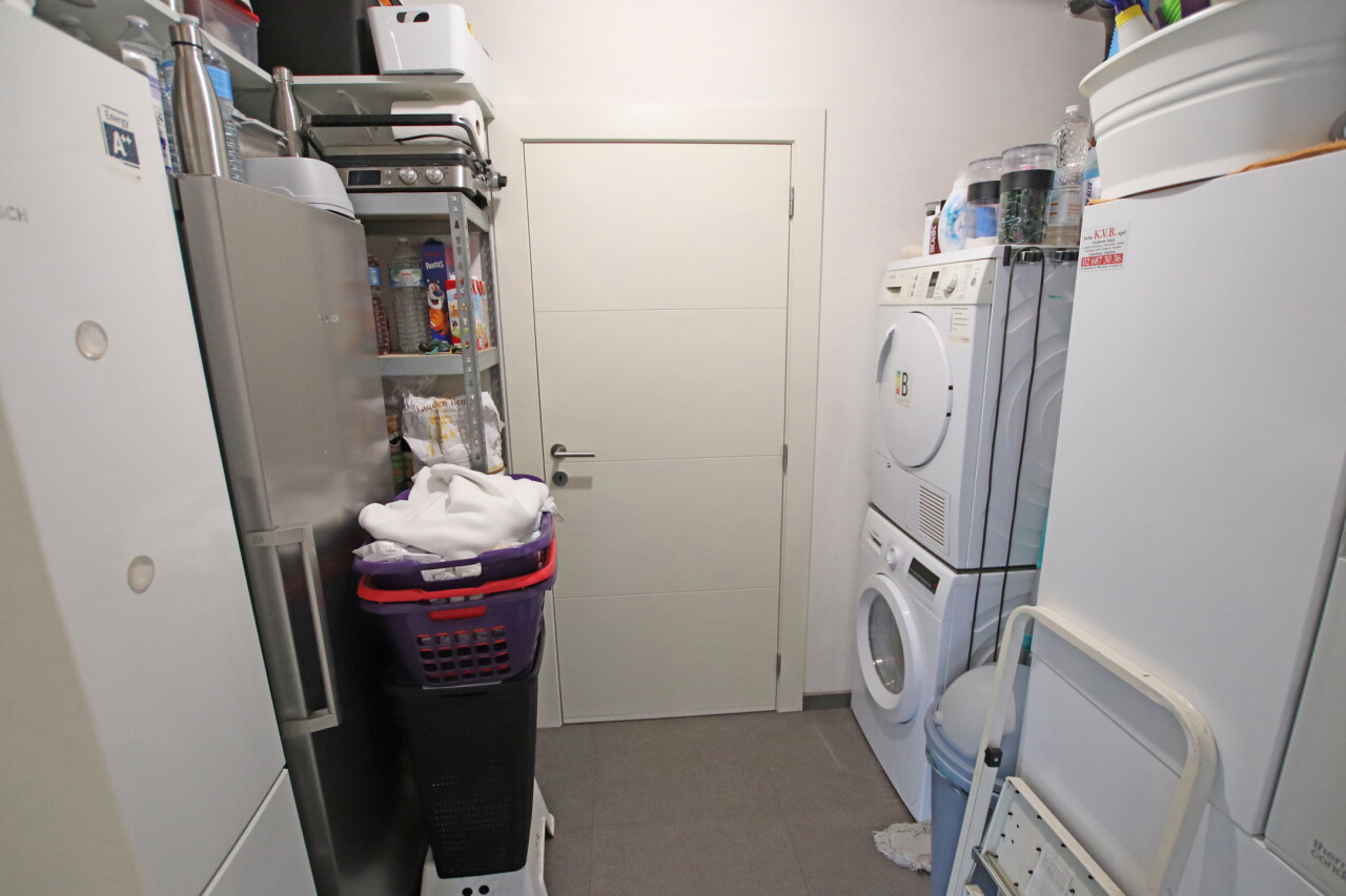 Gelijkvloerse verdieping: inkomhal, apart toilet, 33m² woonkamer met tegelvloer en schuifraam naar terras en tuin, open plan ingerichte keuken van (vaatwasser, kookplaat, oven, microgolf en koelkast), berging/wasplaats, garage voor 1 wagen met automatische poort.