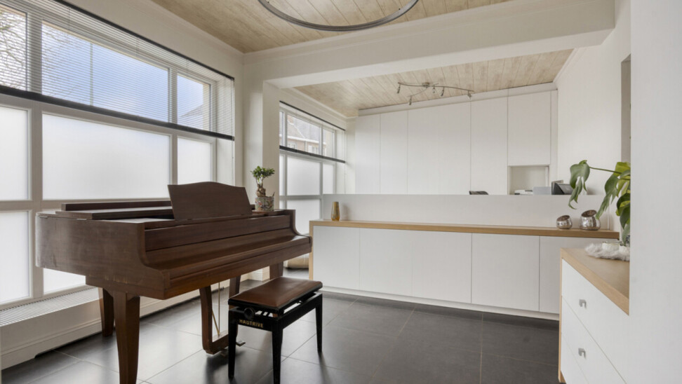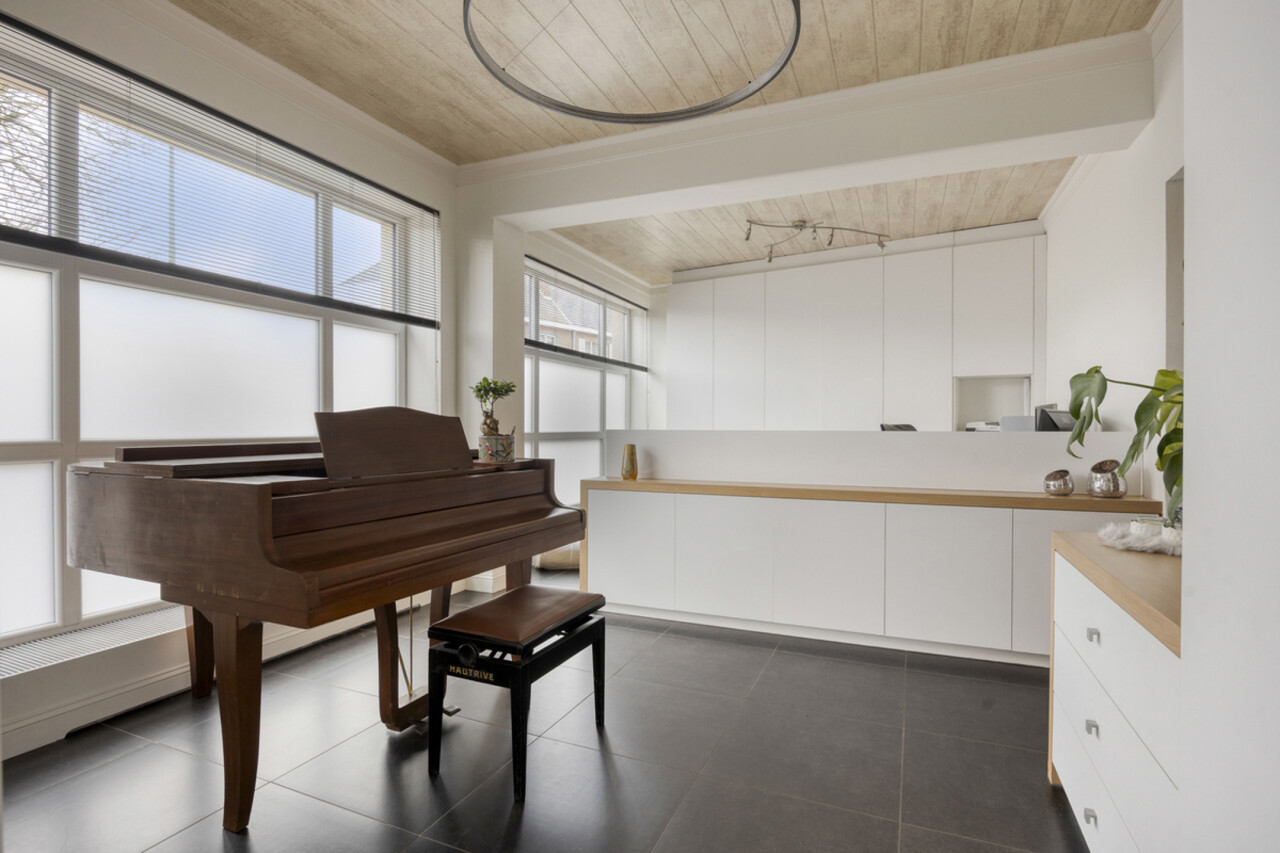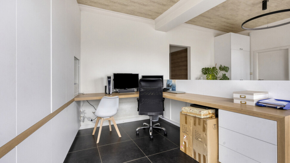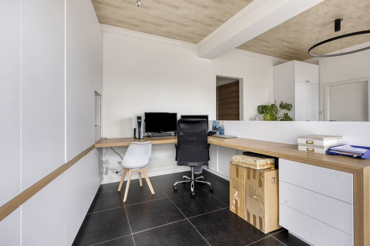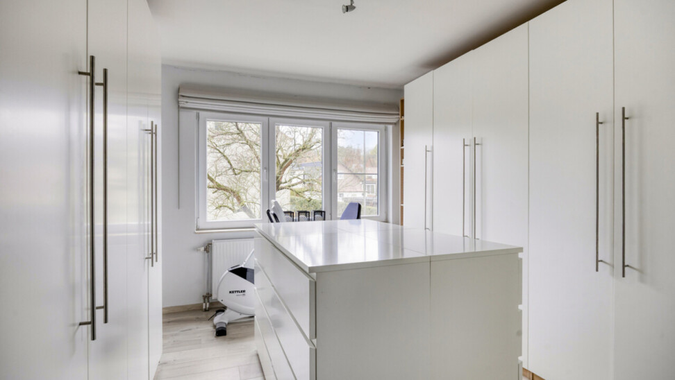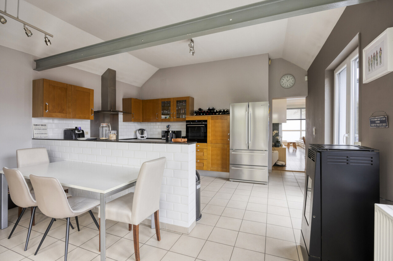 Gelijkvloerse verdieping: inkom, ruim bureel met ingebouwde kasten, 31m² woonkamer met ingebouwde kasten en cassette (pellet), ruime open plan volledig ingerichte leefkeuken met ontbijthoek, apart toilet met wastafel, berging/wasplaats.
