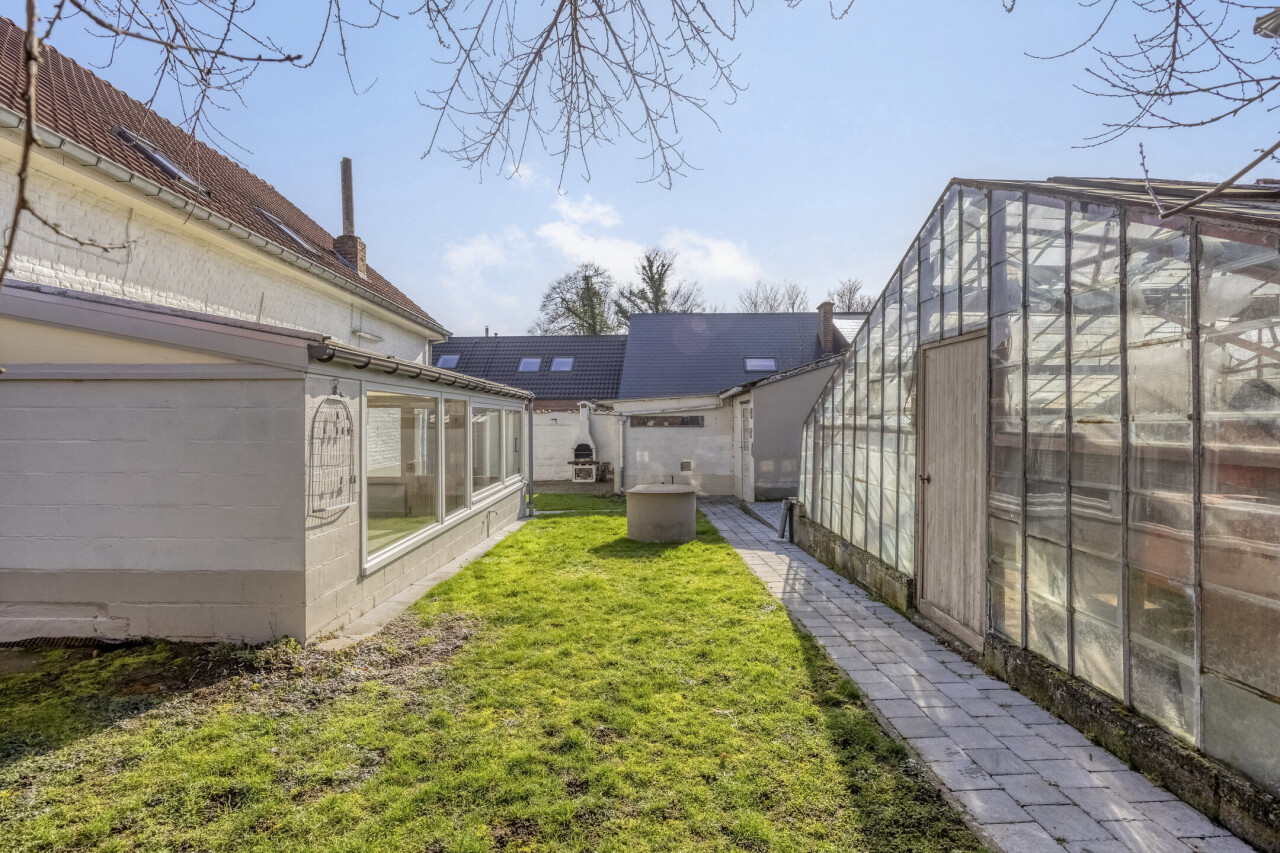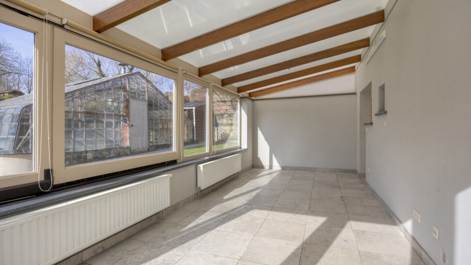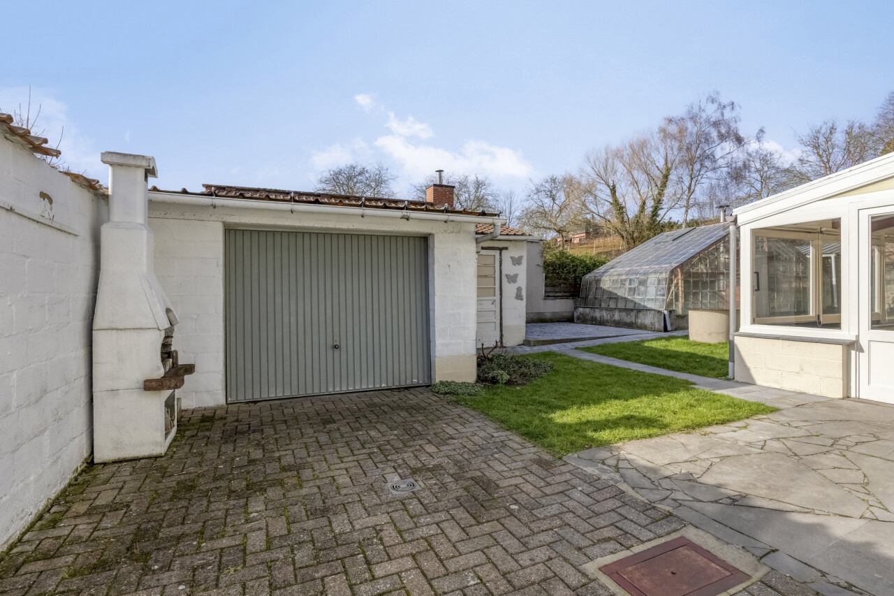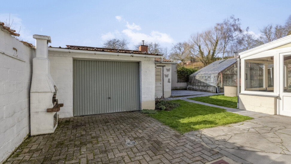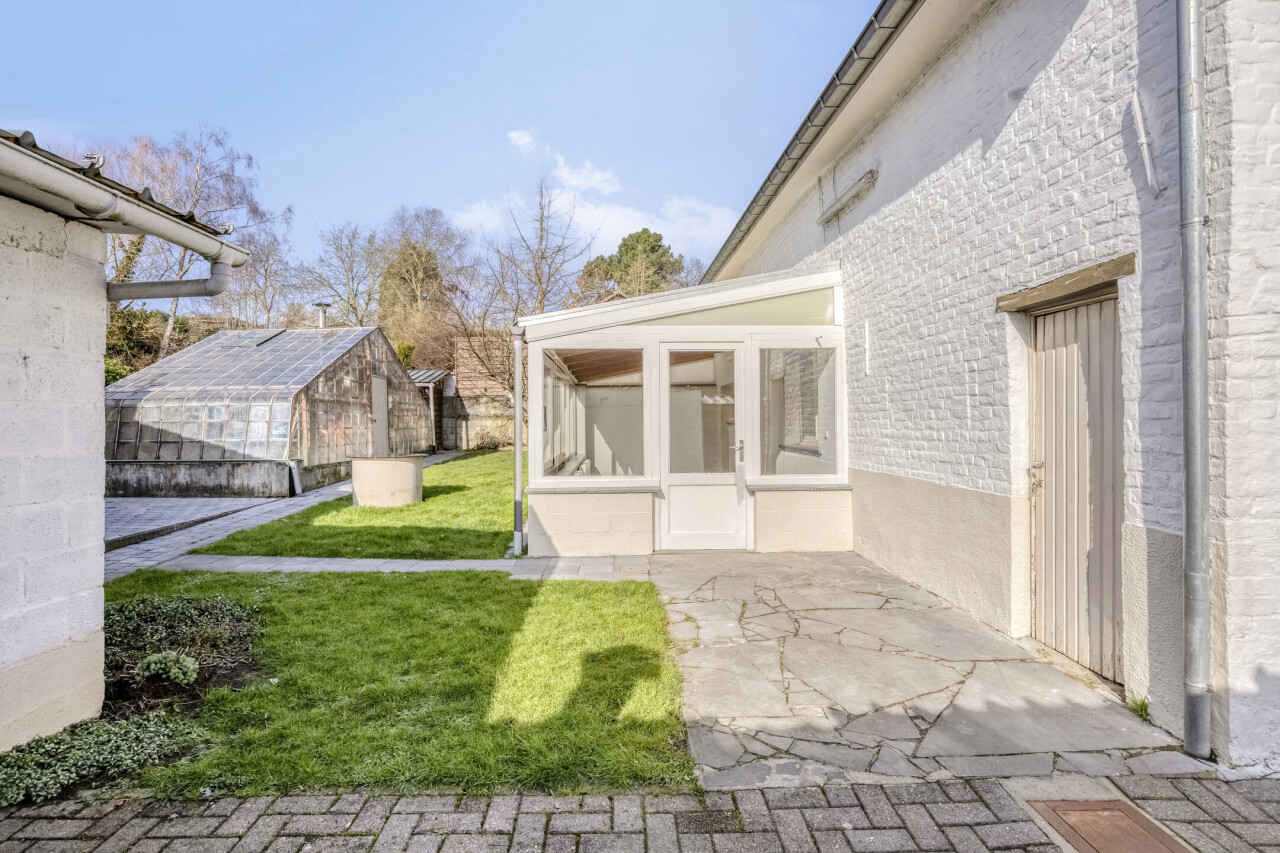 Gelijkvloerse verdieping: inkomhal met apart toilet, 25m² woonkamer, eetkamer/zithoekje, recente volledig ingerichte keuken (2012), ruime veranda (20m²), garage 1 (25m²), garage 2 (23m²), gezellig tuintje met terras, 2 buitenbergingen, leuke serre.