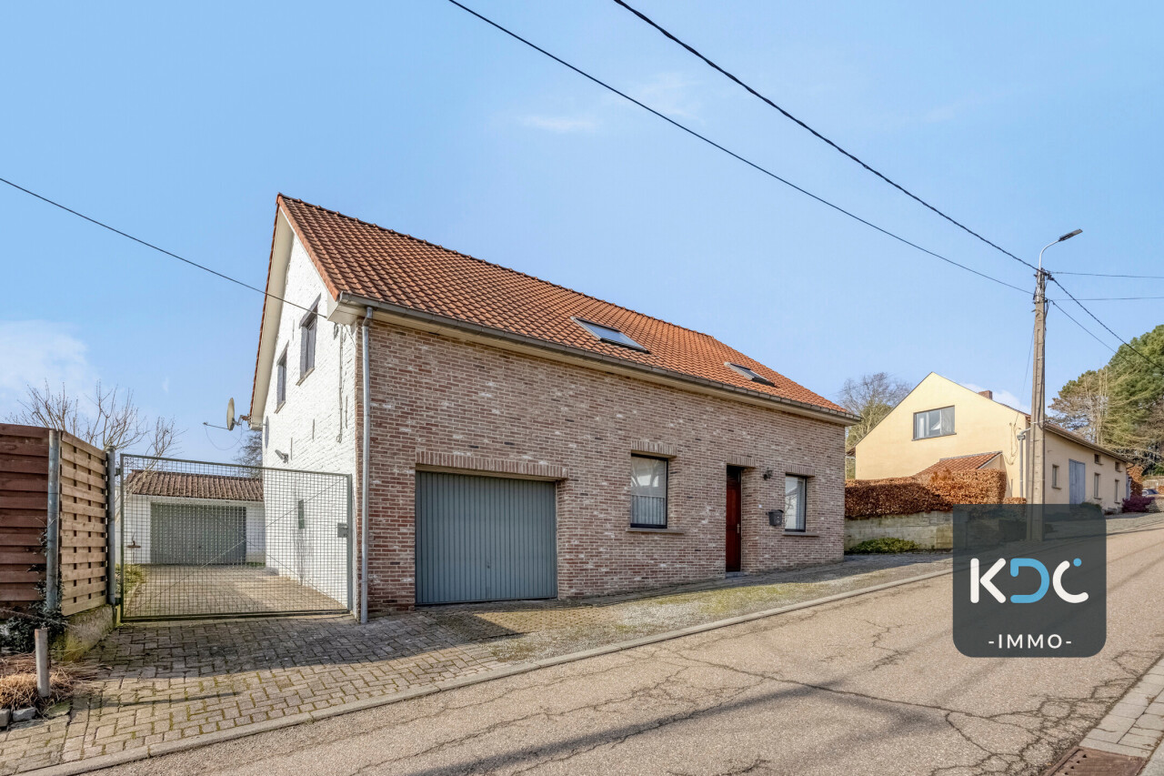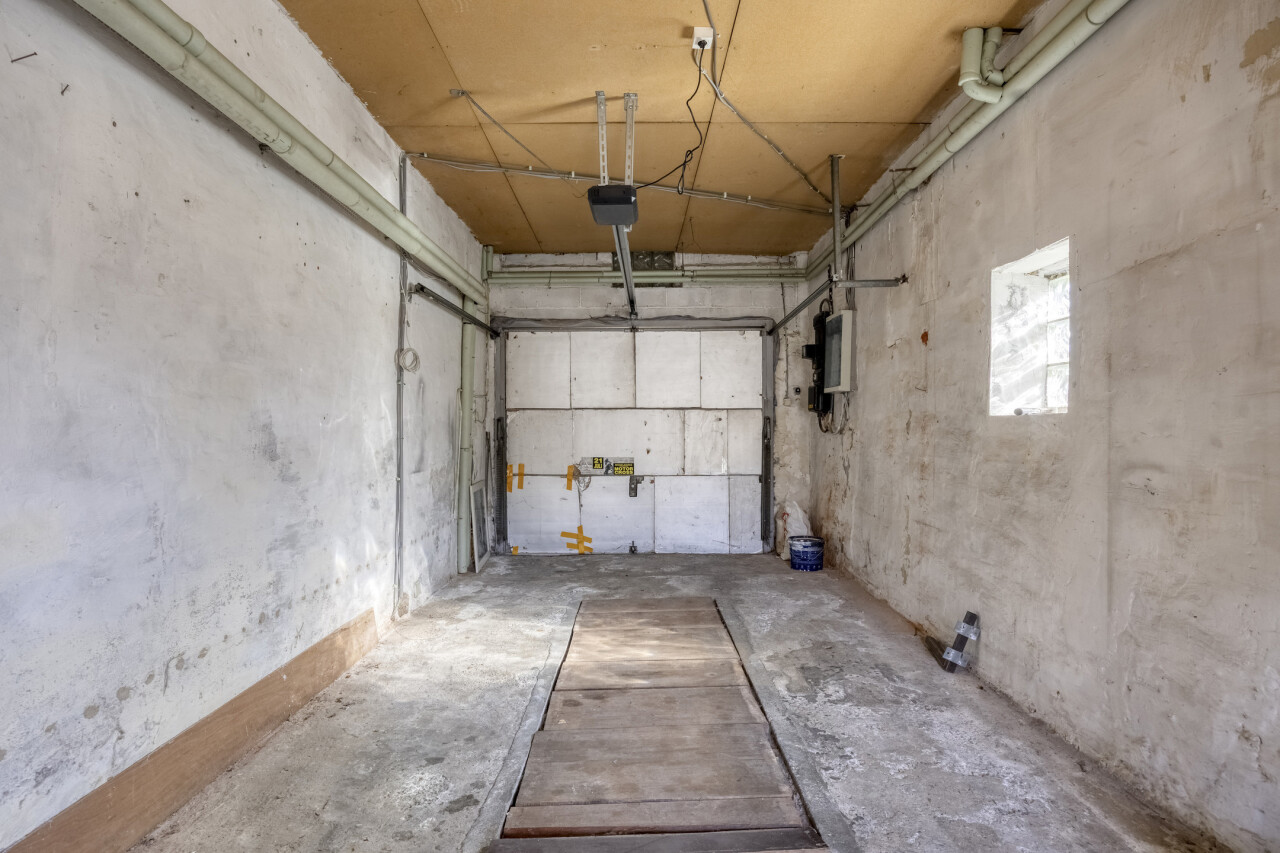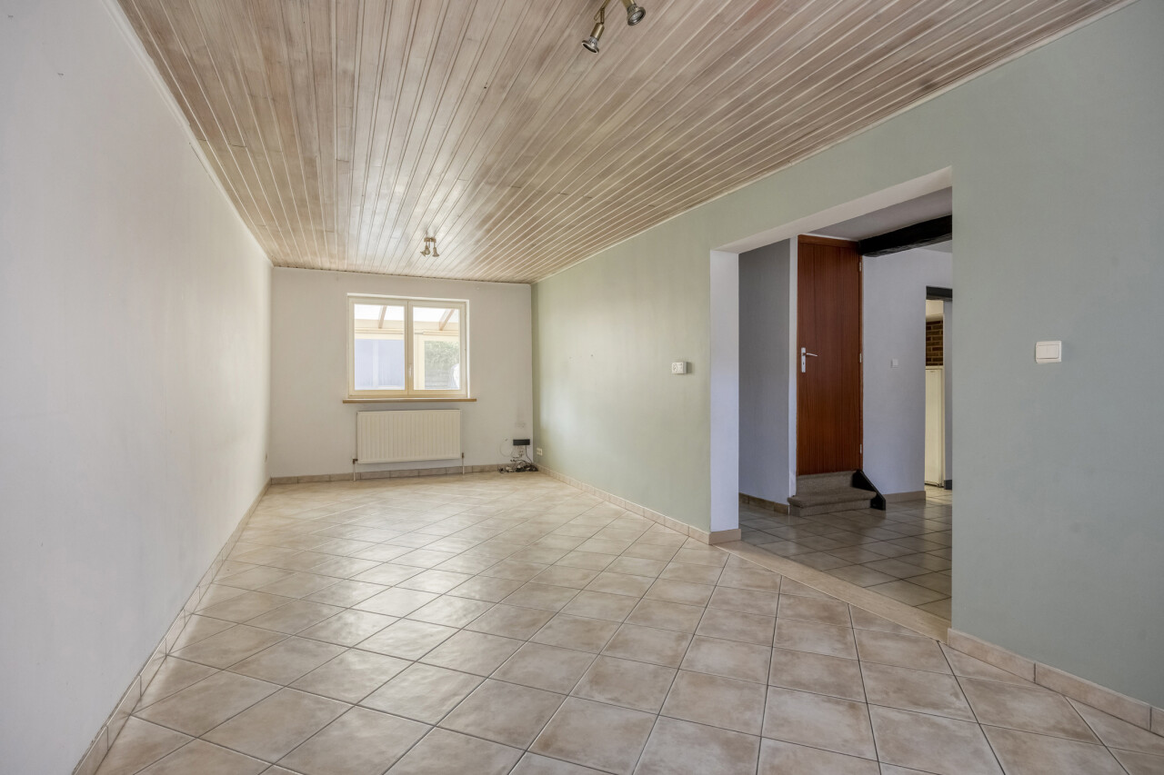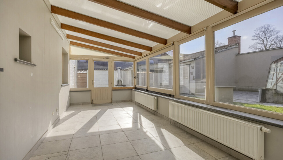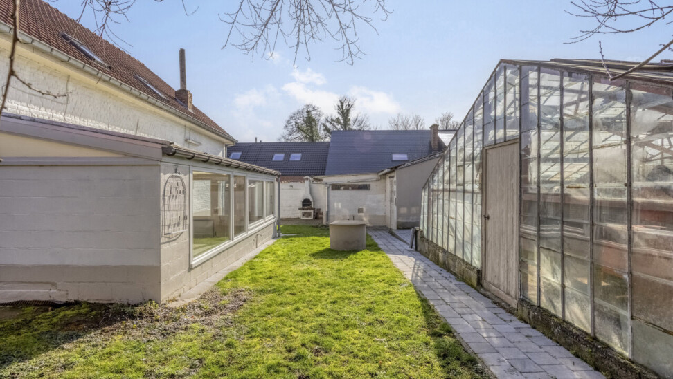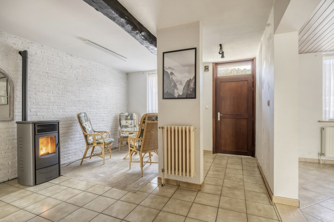Gelijkvloerse verdieping: inkomhal met apart toilet, 25m² woonkamer, eetkamer/zithoekje, recente volledig ingerichte keuken (2012), ruime veranda (20m²), garage 1 (25m²), garage 2 (23m²), gezellig tuintje met terras, 2 buitenbergingen, leuke serre.