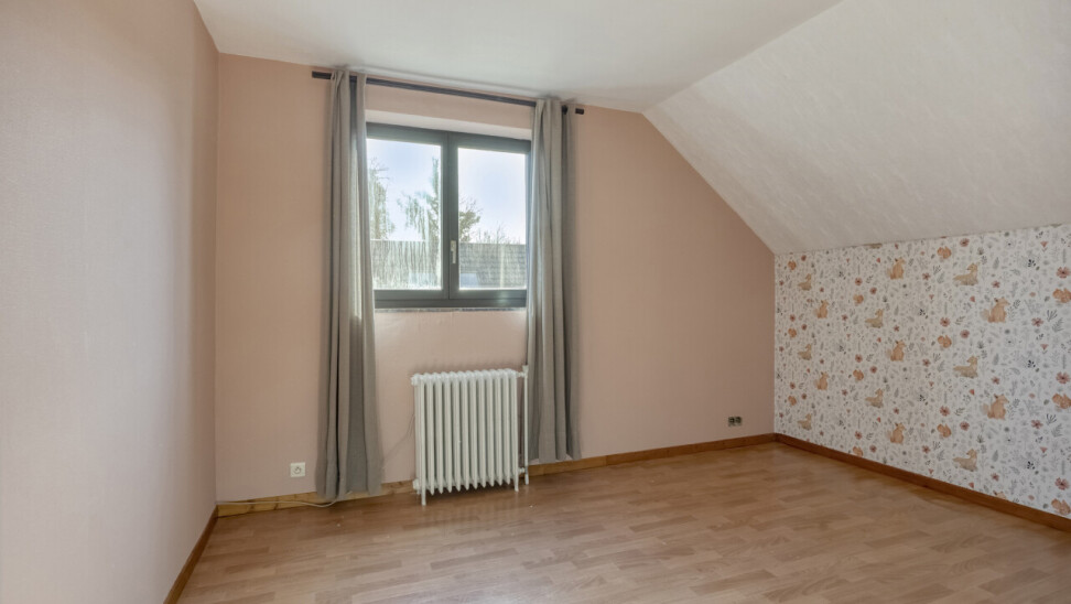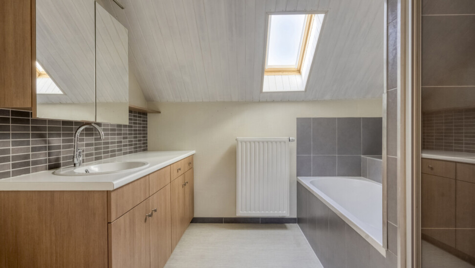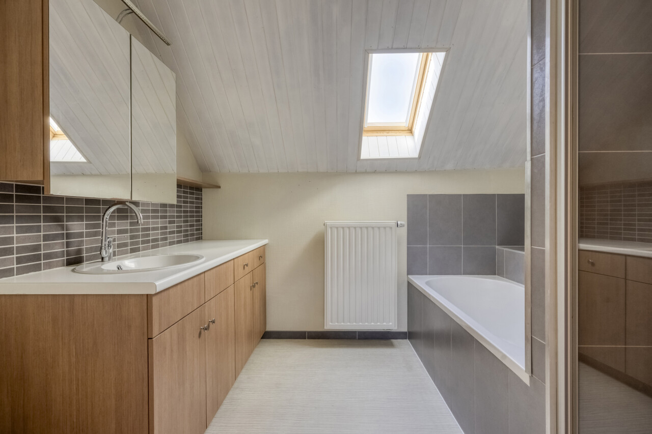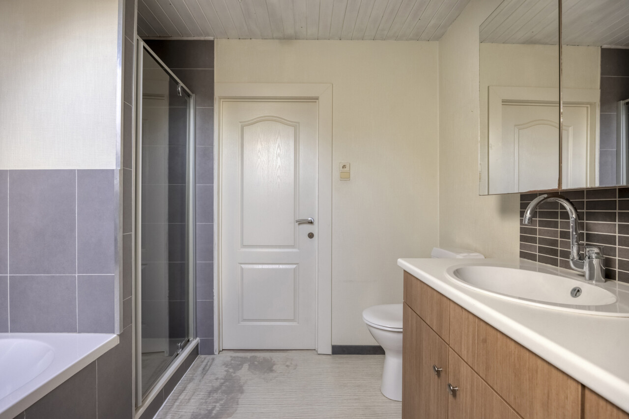 Eerste verdieping: nachthal, 4 slaapkamers (22m² + 12m² + 12m² + 8m²), recent ingerichte badkamer (2014) met ligbad, douche, toilet en 1 wastafel in meubel.